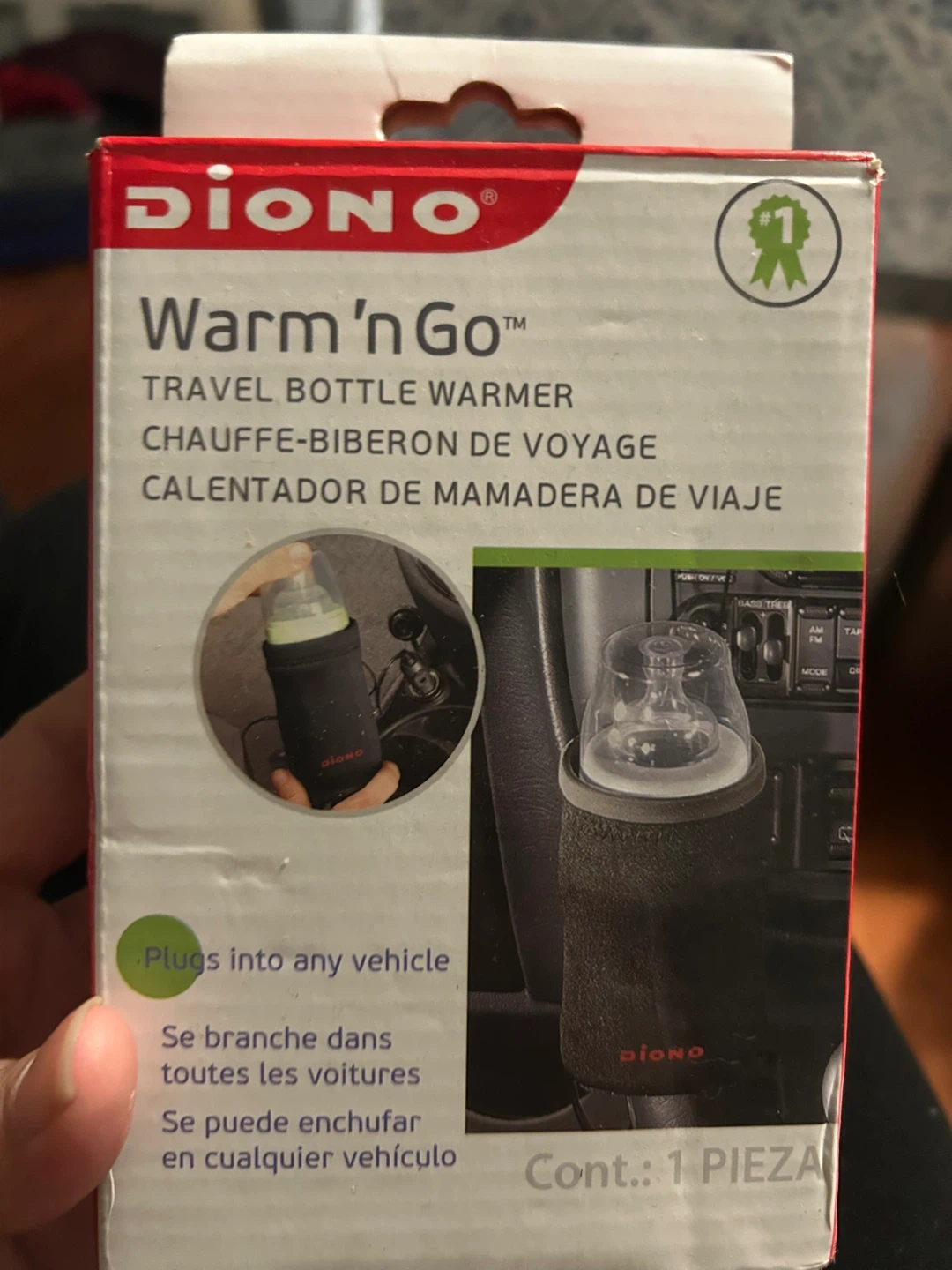 Keep your baby's bottle warm on the go with the Diono Warm'n'Go Travel Bottle Warmer! It plugs into any vehicle and warms bottles quickly. The unique heating element stretches to fit any bottle shape. An indicator light shows when the power is on. It also fits in a cup holder or hangs from the dashboard. Box included