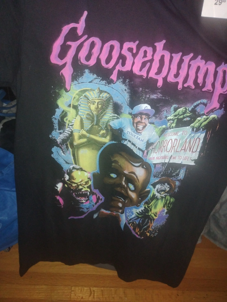 Selling a Goosebumps Horrorland graphic tee in size medium! The tee is black with a colourful print featuring characters and imagery from the Goosebumps series. The original price was $29.99
