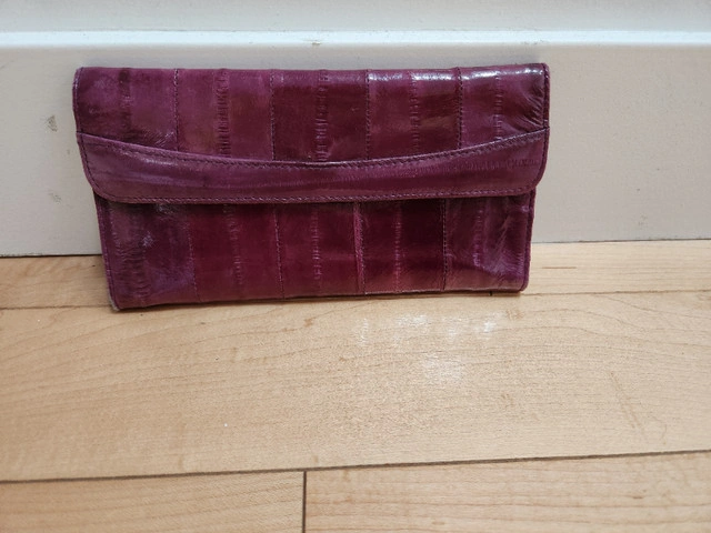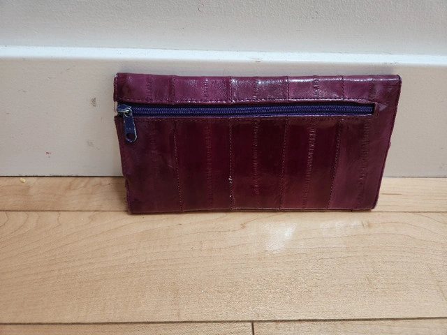 Selling a genuine maroon eel skin leather wallet trifold purse in good condition. Dimensions: 7.25" (L) x 3.75" (W). Comes from a smoke & pet free home.