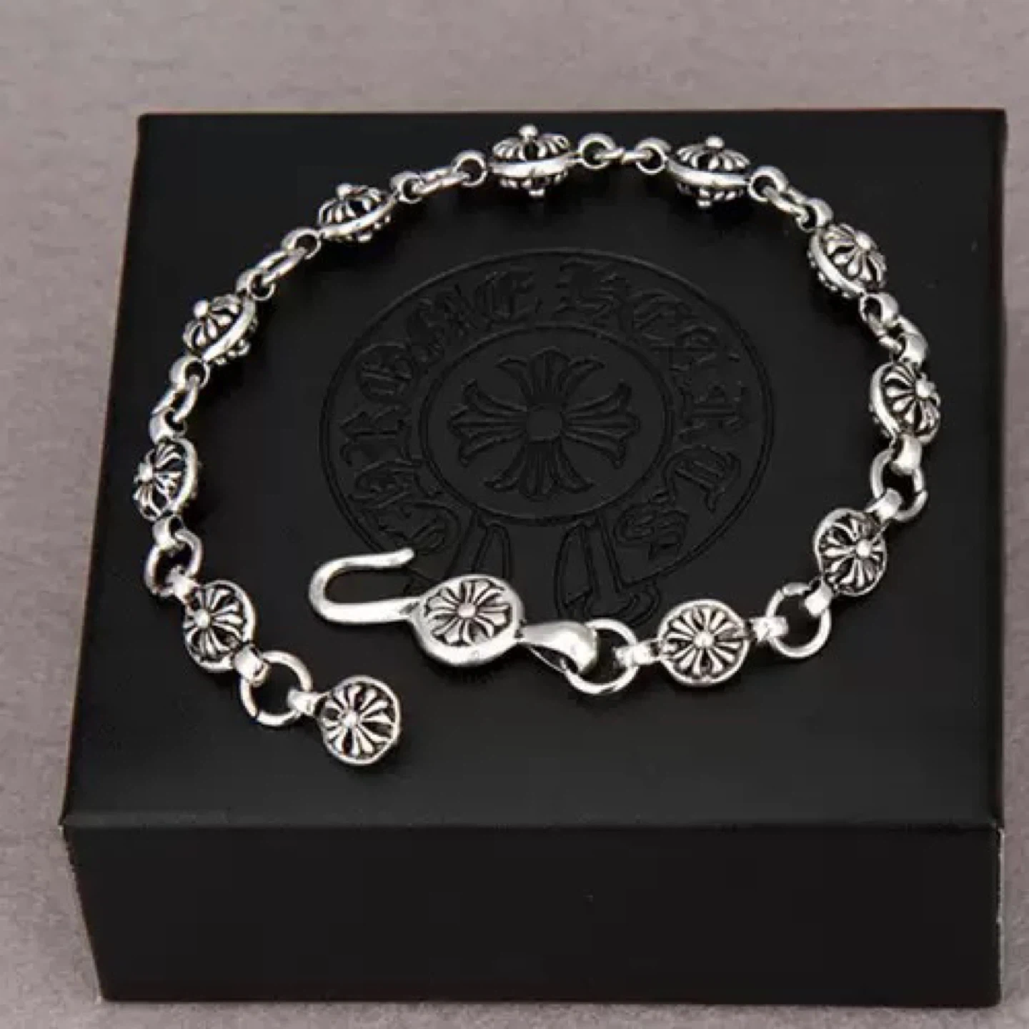 Selling a Chrome Hearts bracelet in great condition! The bracelet is silver and features the signature Chrome Hearts floral cross design. Comes with the original box!