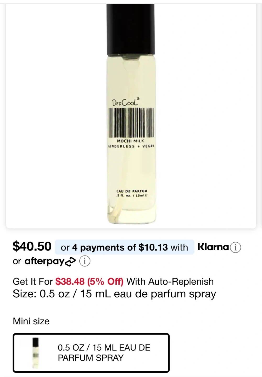 Selling a DedCool Mochi Milk Eau de Parfum in the 0.5 oz / 15 mL size. It's a genderless and vegan fragrance with a marshmallow and vanilla bean profile. It smells like a soft, pillow-y marshmallow cloud! Originally retailed for $40.50 plus tax