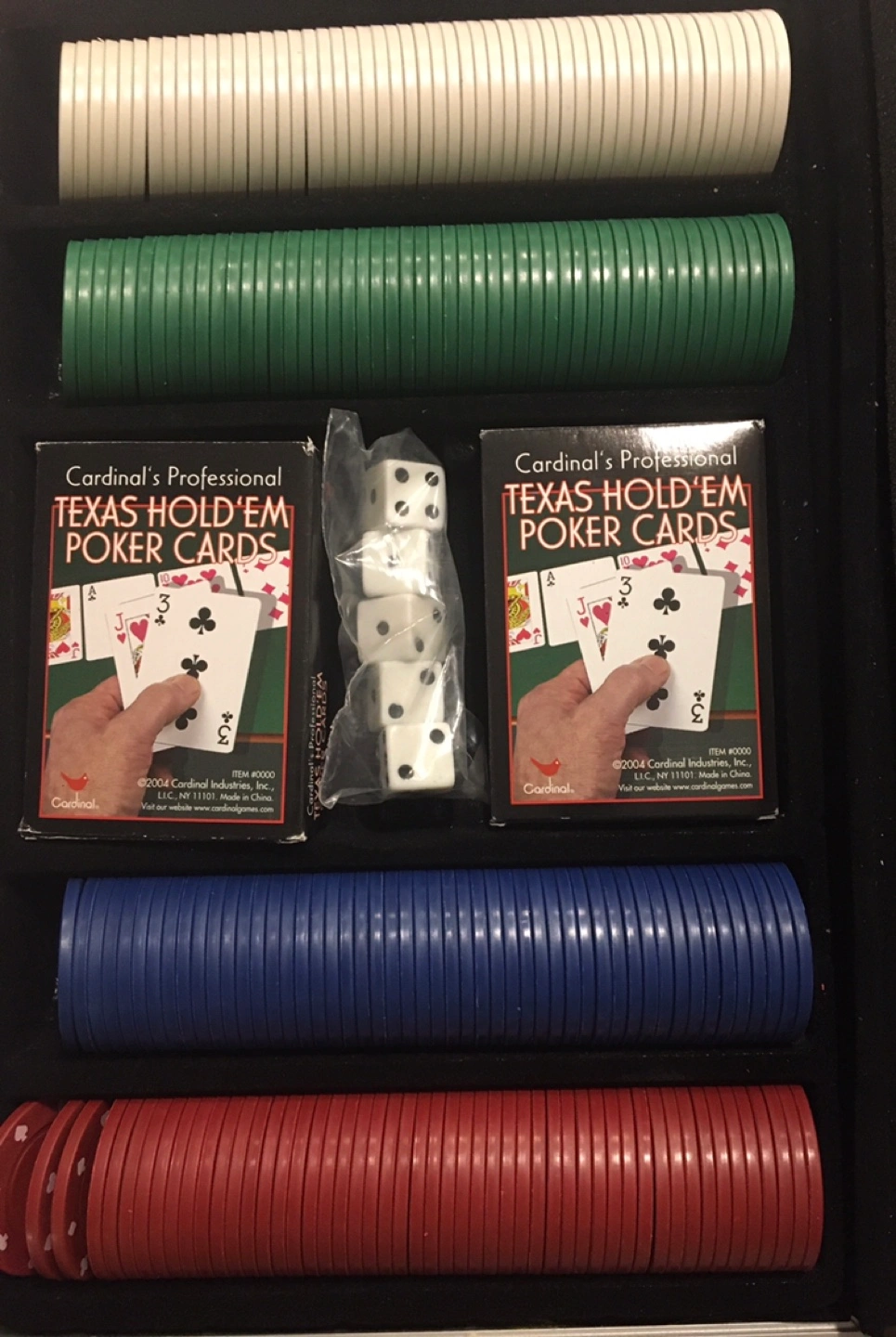 * Includes: Cards, dice, and multiple colored chips, carrying case.