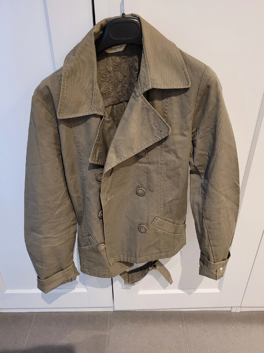 132Olive Green Jacket Size Large Here's a stylish olive green. It's a double-breasted design with a belt. A great addition to any wardrobe!