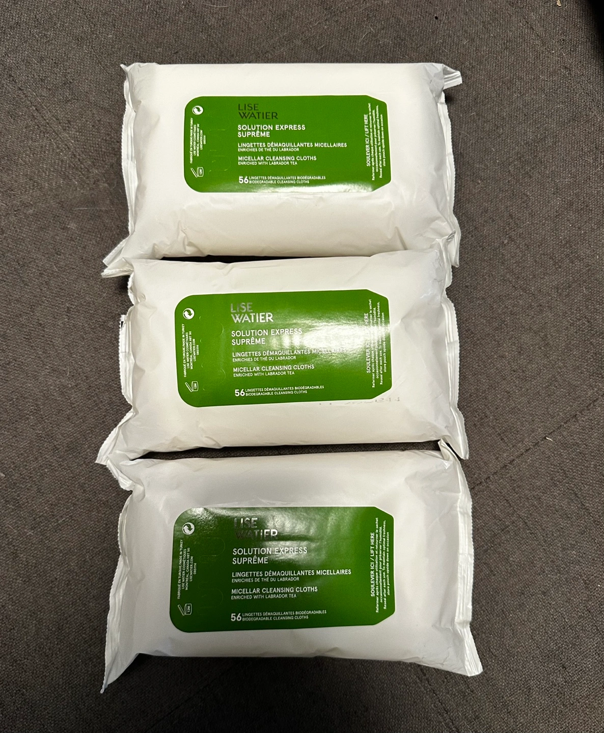 Three brand new packs of Lise Watier Solution Express Supreme Micellar Cleansing Wipes. Biodegradable wipes enriched with Labrador tea. 56 wipes per pack. Remove makeup, clean and tone.