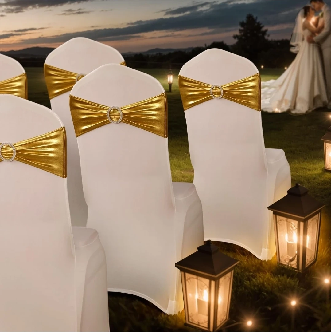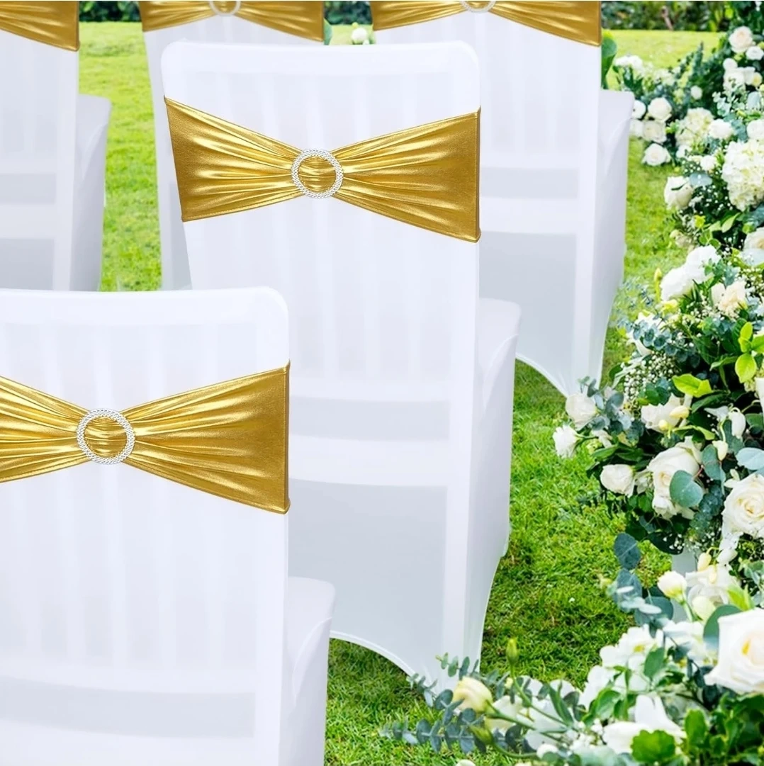 Set of white spandex chair covers designed for events. Each cover features a shimmering gold satin sash cinched with a rhinestone buckle. Highly stretchable fabric ensures a snug fit on most standard chairs. Neatly sewn edges for a clean finish.