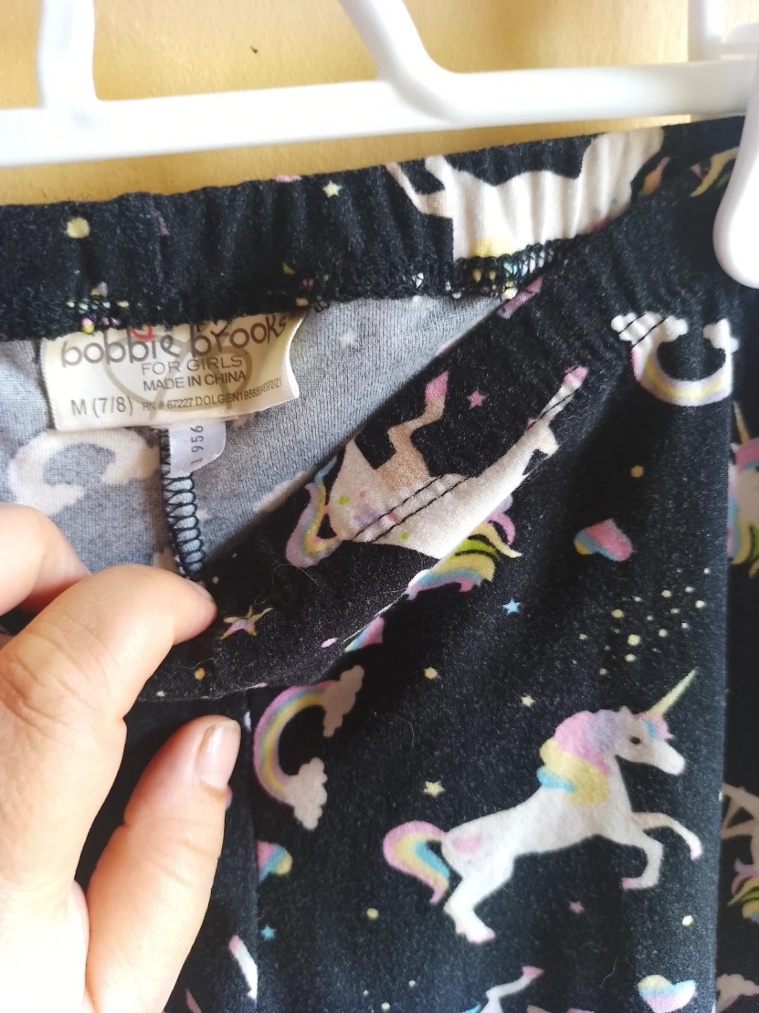 Black leggings for girls featuring a fun unicorn and rainbow print. Made by Bobbie Brook. Size M (7/8).