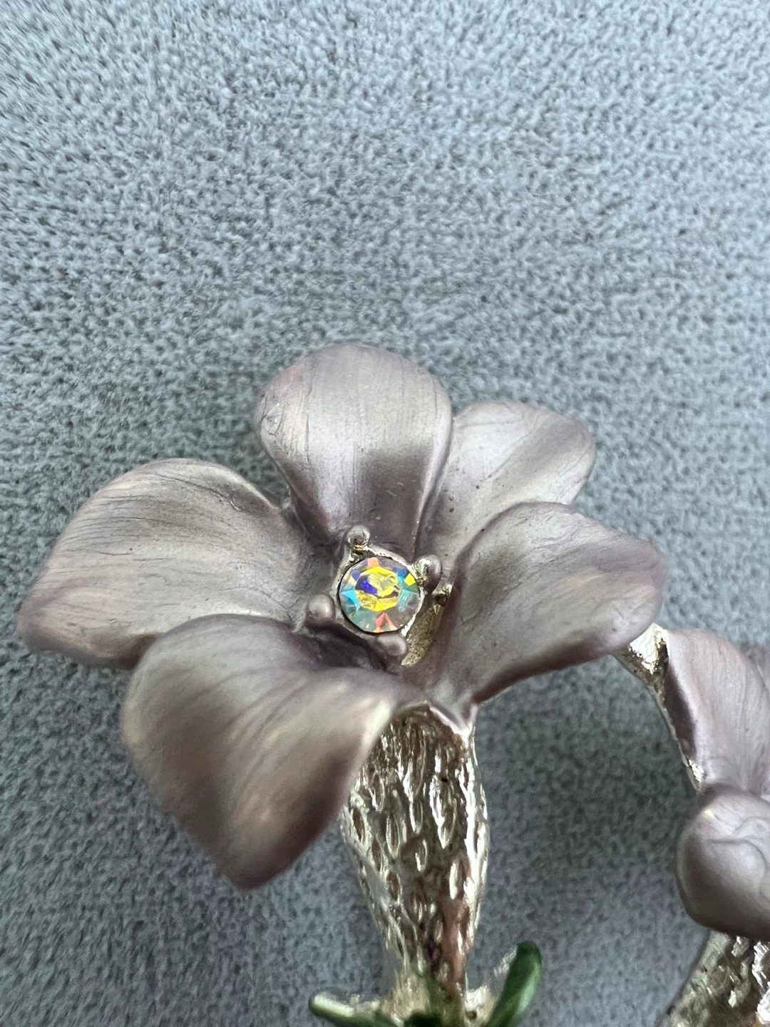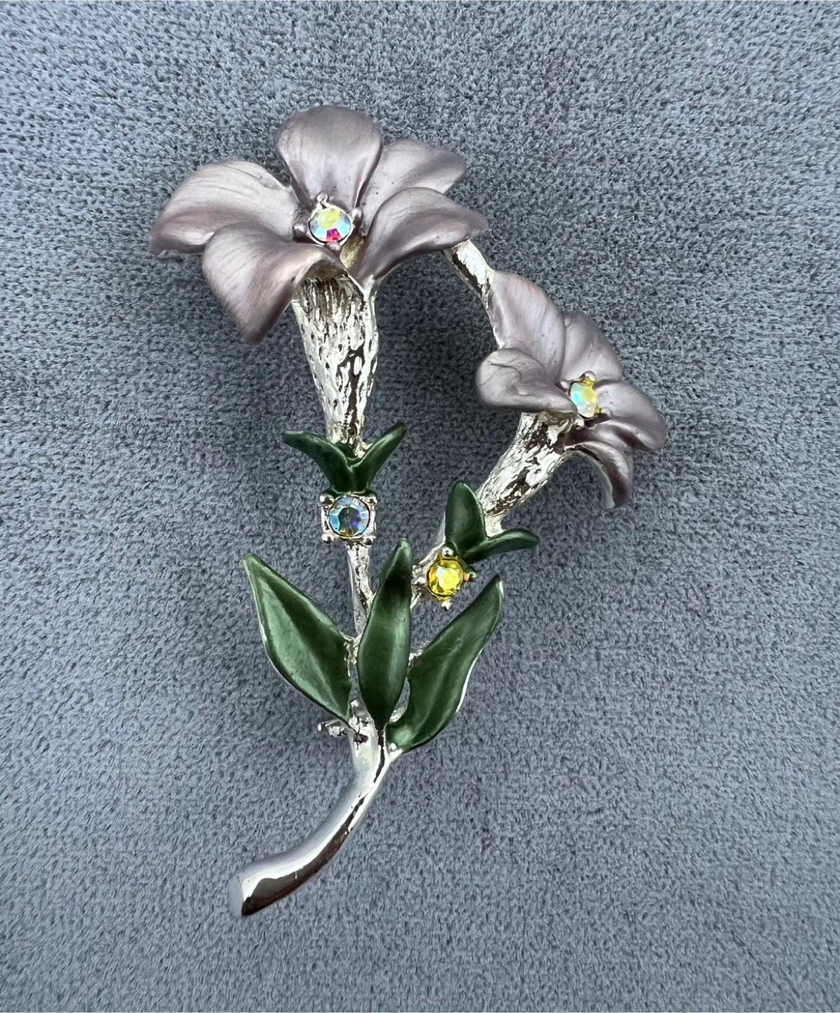 Layered petals shimmer with rich enamel, accented by sparkling rhinestones and finished with delicate silver inlay for a touch of timeless beauty