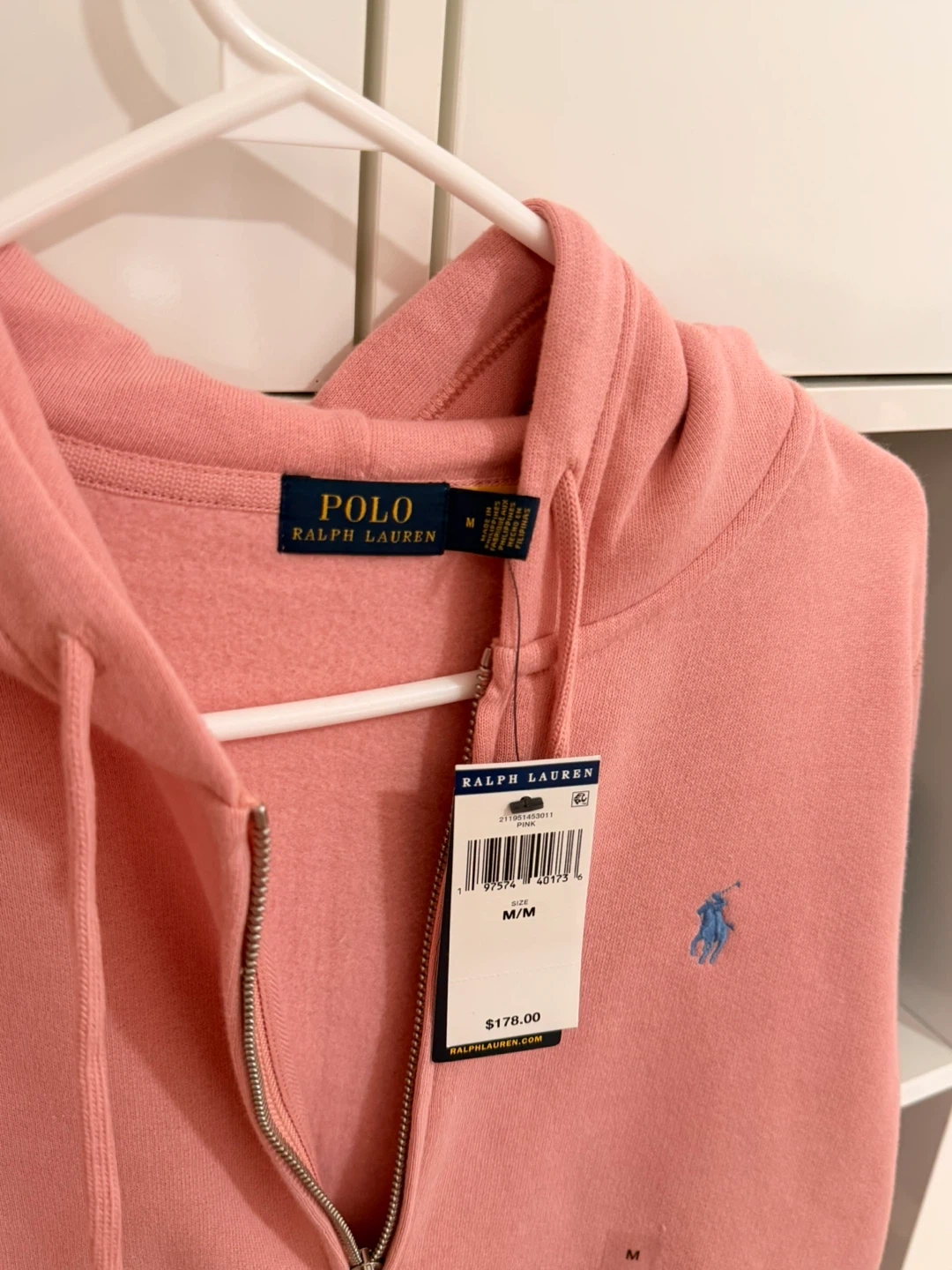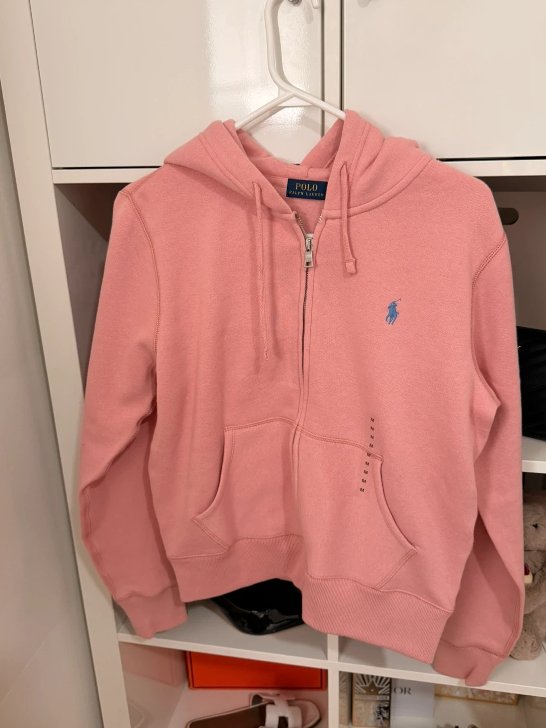 This is a pink zip-up hoodie from Polo Ralph Lauren. It's a size medium with the signature Polo Player logo embroidered on the chest. Features a full zip closure and front pockets.