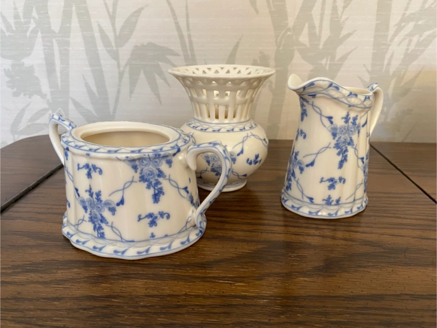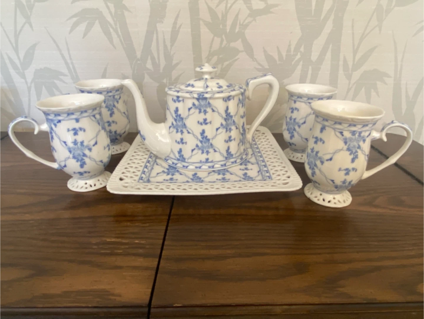 This is a charming set including a teapot, four cups, a sugar bowl, and a creamer. It features a delicate blue floral pattern on white porcelain. The set includes a decorative lace-style tray for the teapot along with a small bud vase.