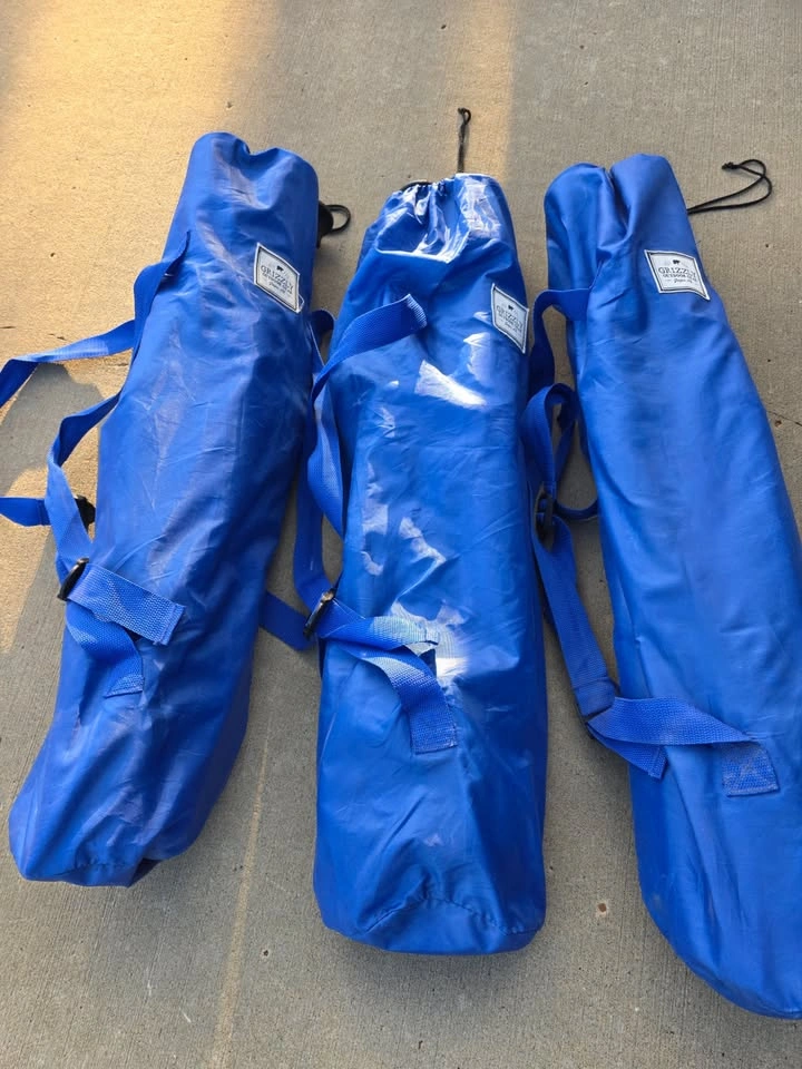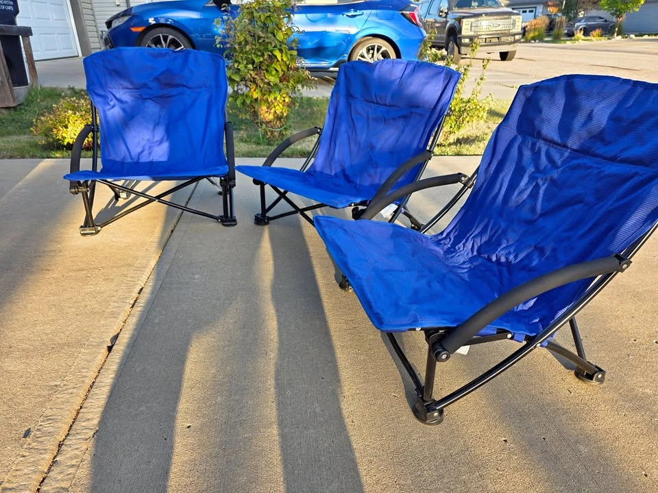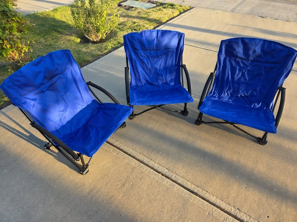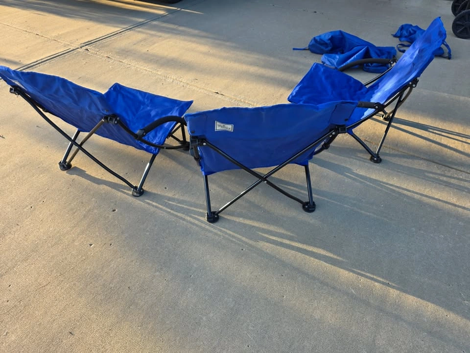 Three Beach Folding Chairs with Padded Armrest in excellent condition, for camping, beach, festivals, garden, caravan trips, fishing, BBQ, w/ carry bags. They can be sold in any combination of 1, 2 and/ or 3. The chairs were used only once at an Edmonton Festival. Cash payment only