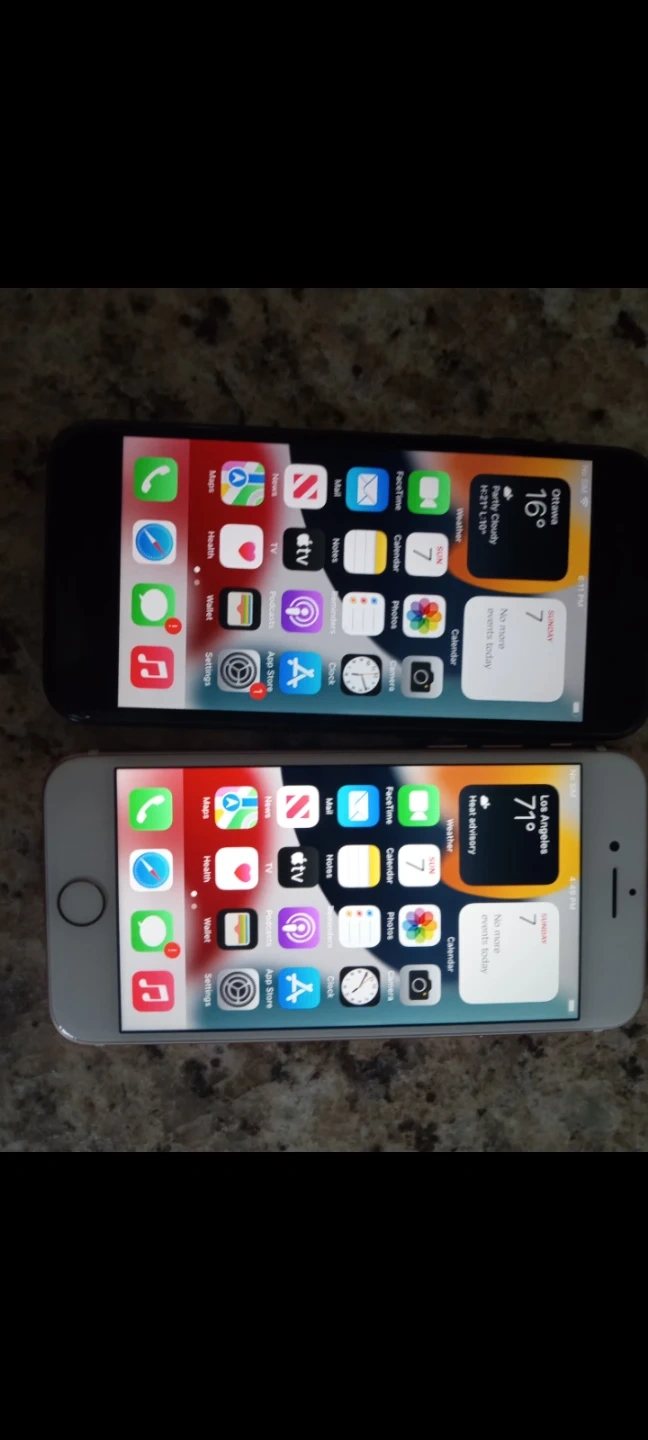 Two Apple iPhones, one black and one white. Both phones display the iOS home screen. Great for everyday communication and apps!