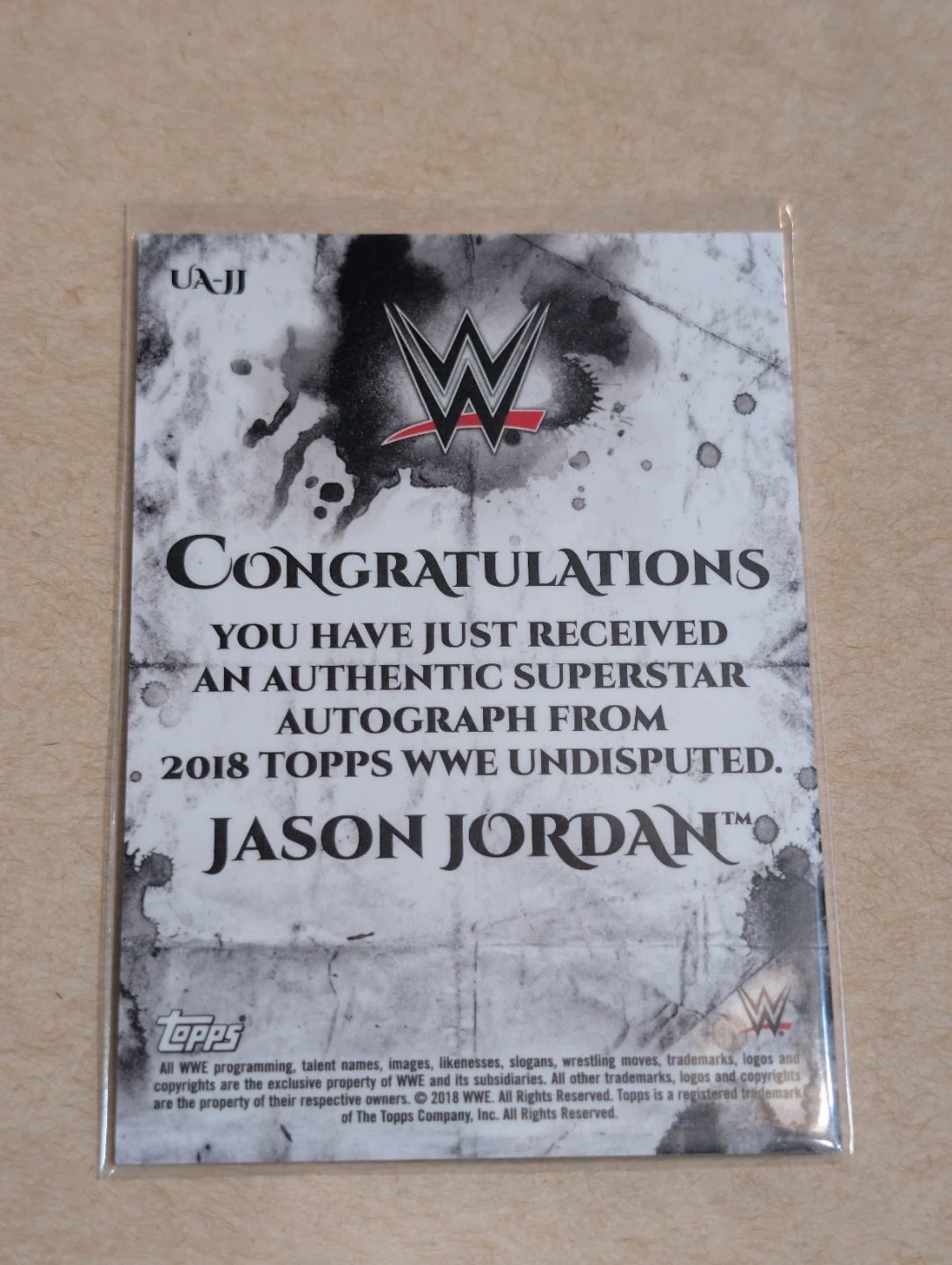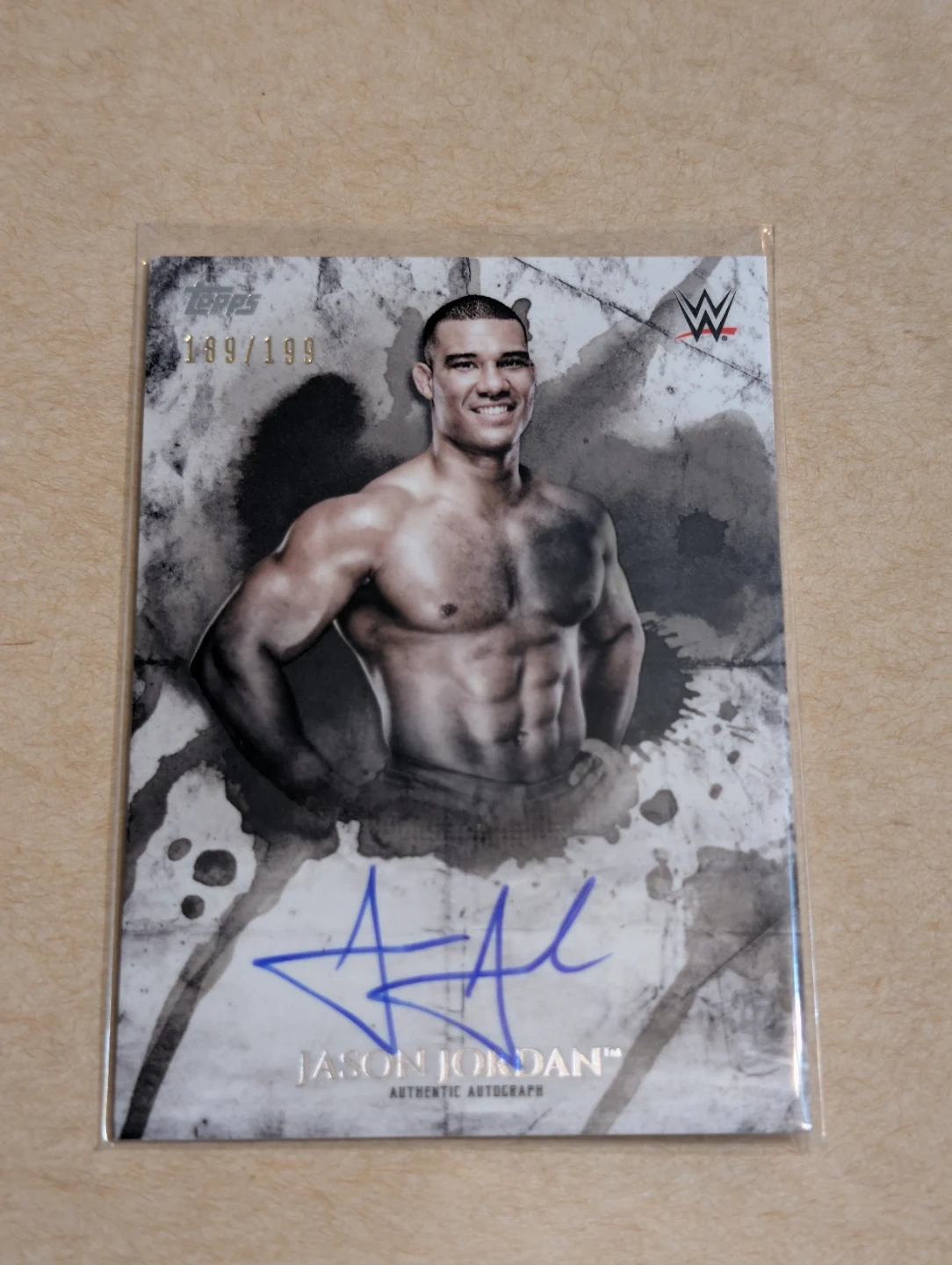 This is an authentic autographed trading card of WWE superstar Jason Jordan from the 2018 Topps WWE Undisputed set. It's a limited edition, numbered 189 out of 199. This card features a 'Congratulations' message indicating it's an authentic autograph.