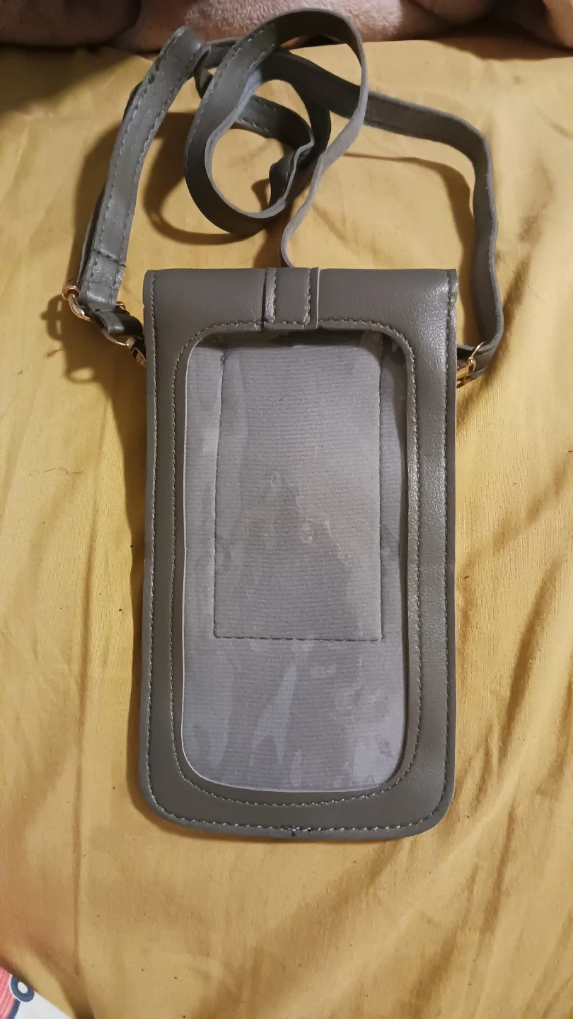 This grey crossbody bag is designed for your cell phone. It features a clear window on the front/back for easy screen viewing. The leather and gold colored clasps offer a stylish look and the strap is extendable.