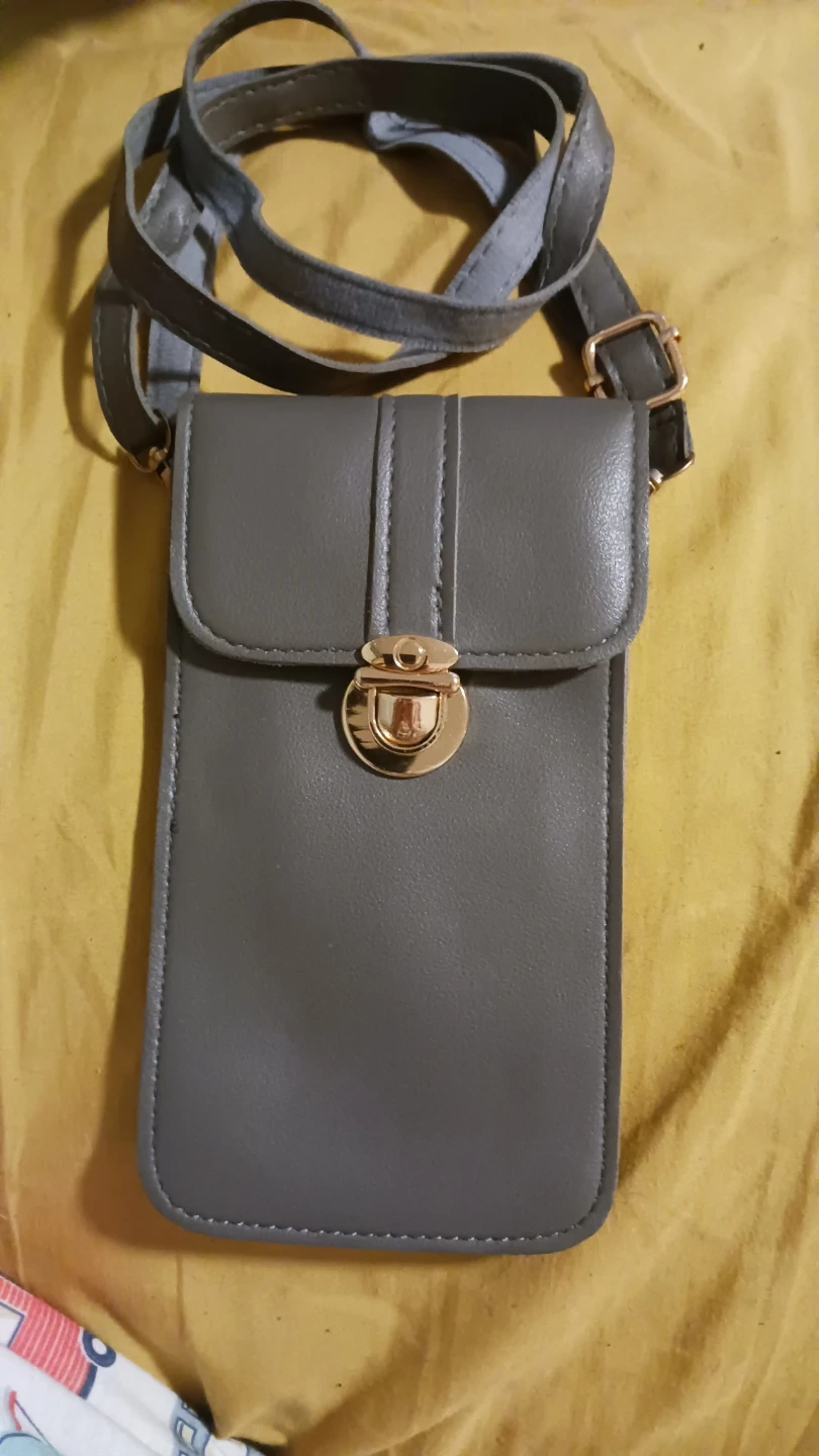 This grey crossbody bag is designed for your cell phone. It features a clear window on the front/back for easy screen viewing. The leather and gold colored clasps offer a stylish look and the strap is extendable.