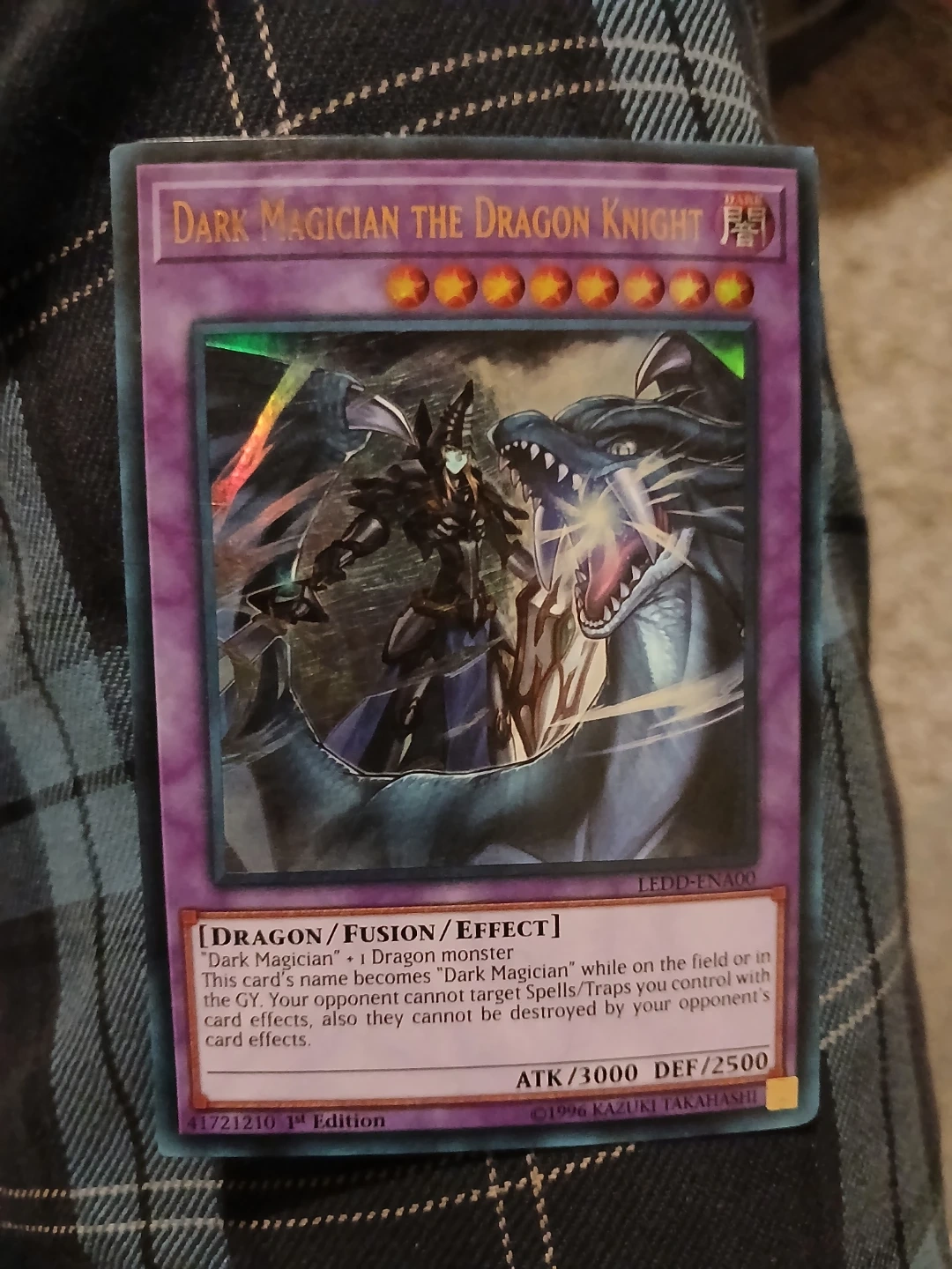 Yu-Gi-Oh! TCG card 'Dark Magician the Dragon Knight'. It's a Fusion/Effect monster with 3000 ATK and 2500 DEF. This card is 1st Edition. Cash only. Pick up or meet up in public place.