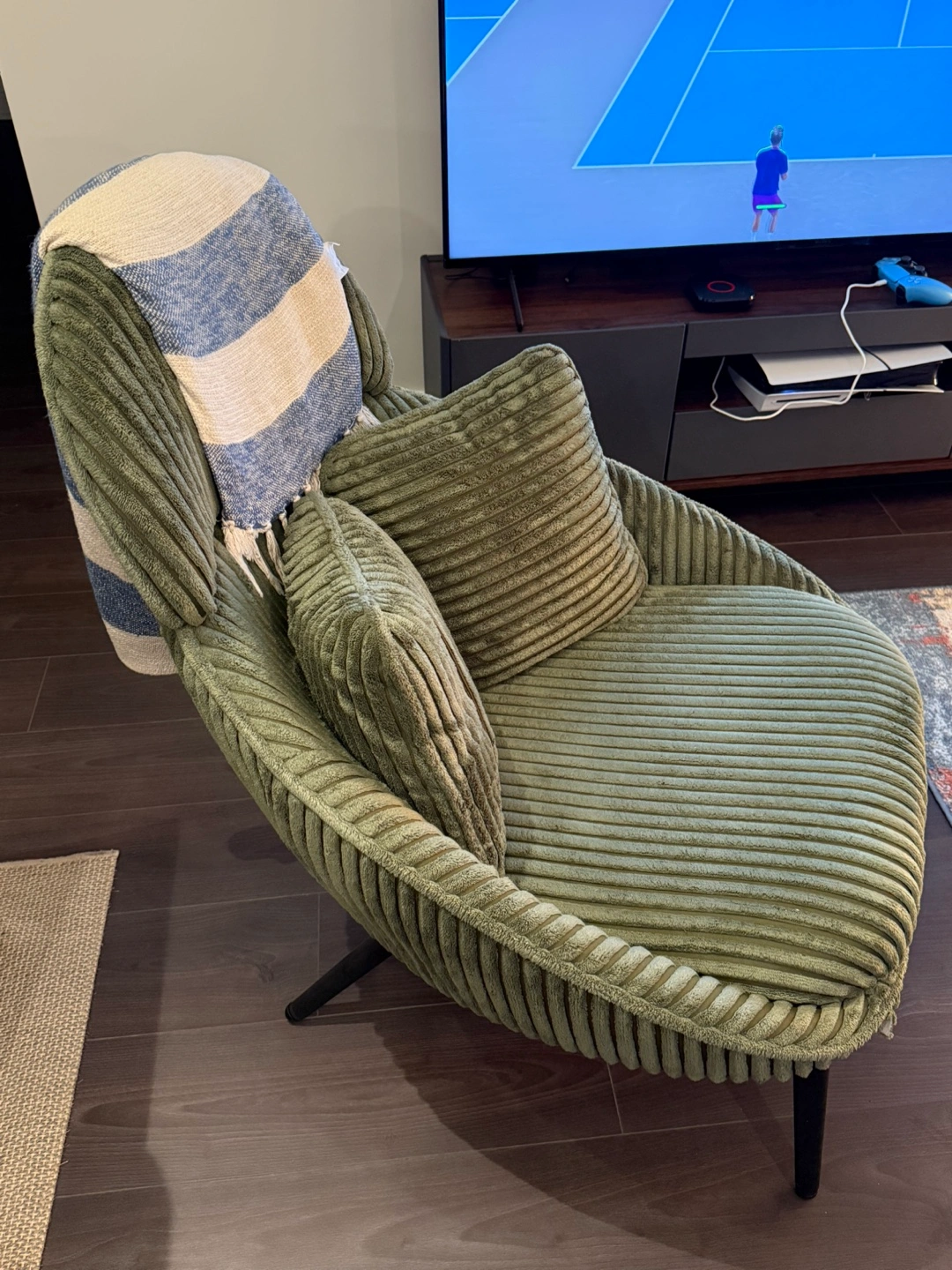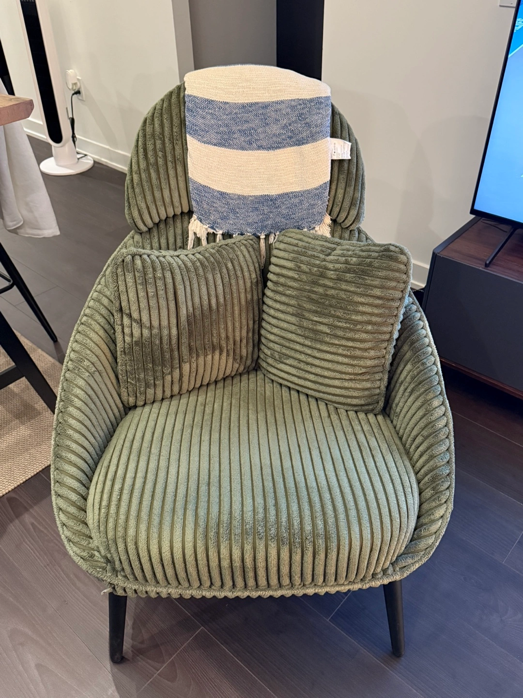 Looking to add a cozy touch to your space? This olive green corduroy accent chair is perfect! It comes with two matching pillows for extra comfort. The chair has a width of 31 inches, a height of 37 inches, and a depth of 35 inches