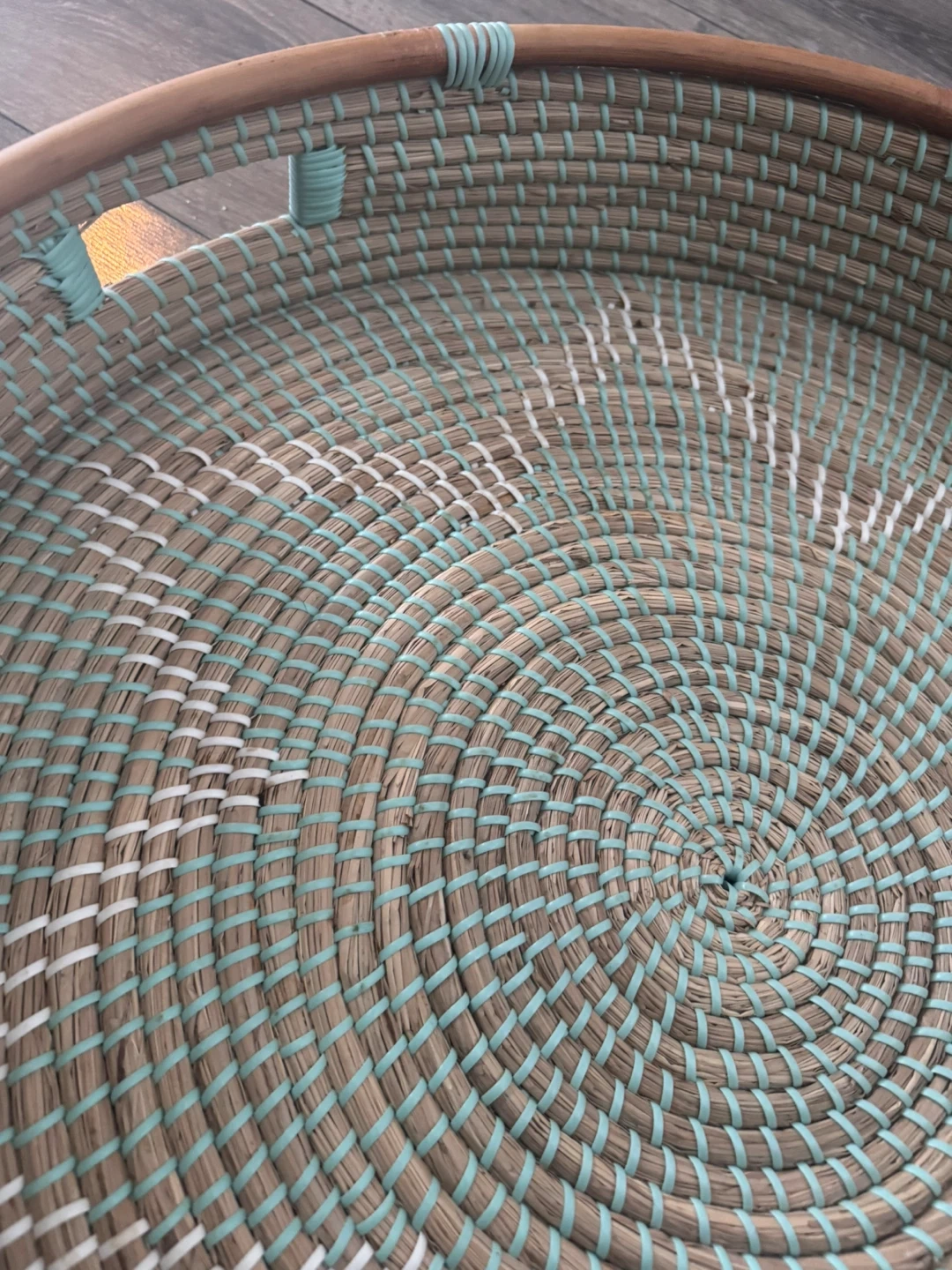 A decorative woven tray featuring a light blue and white pattern. It has a sturdy wooden rim and is perfect for serving or display. Use it on a coffee table or as a centrepiece!