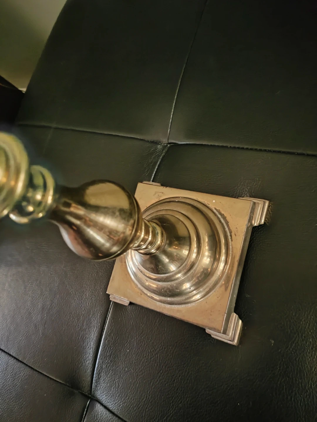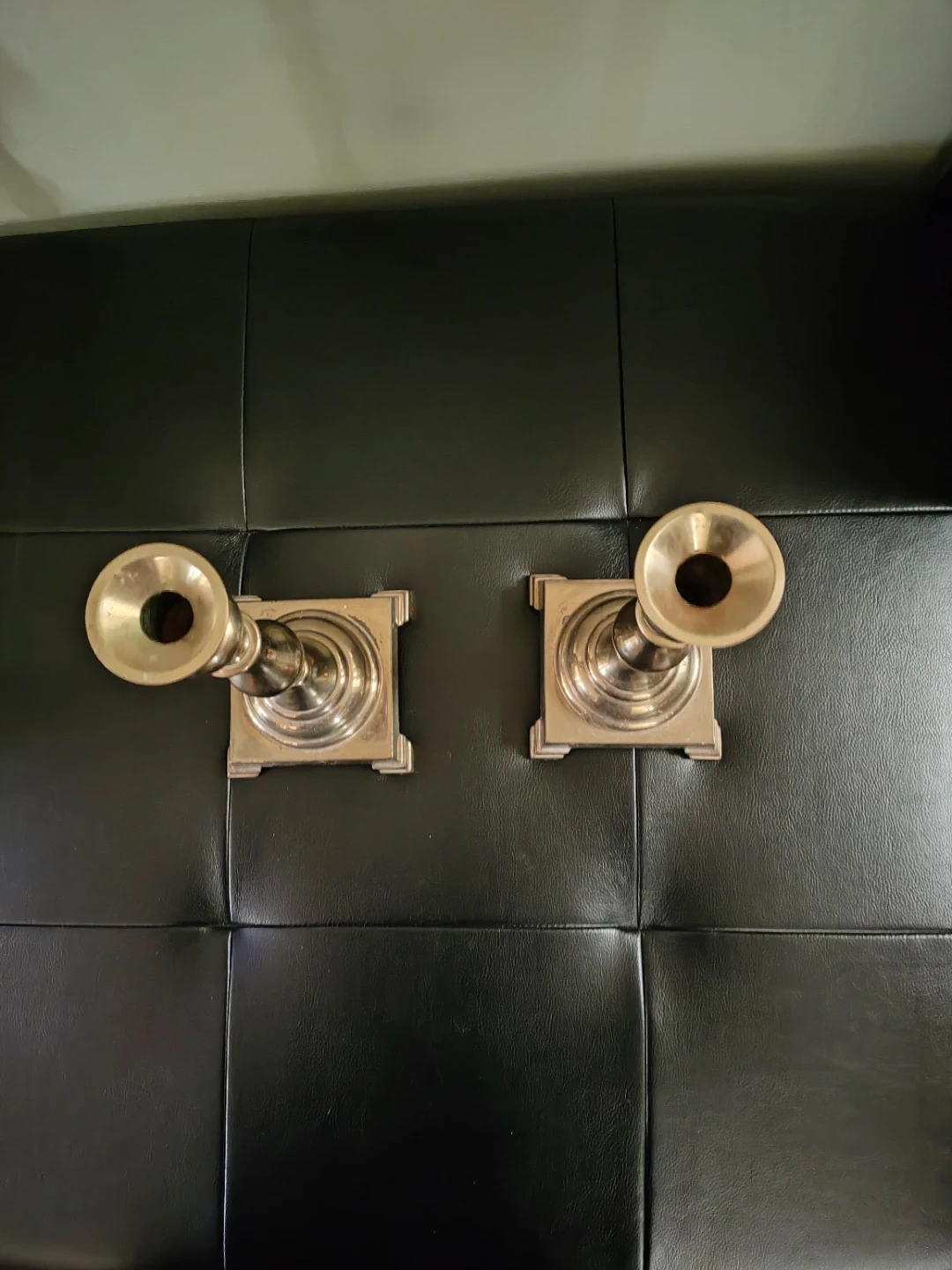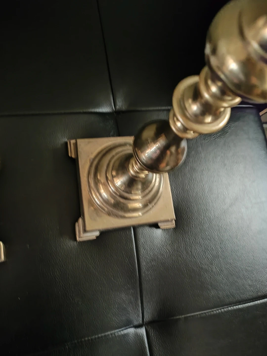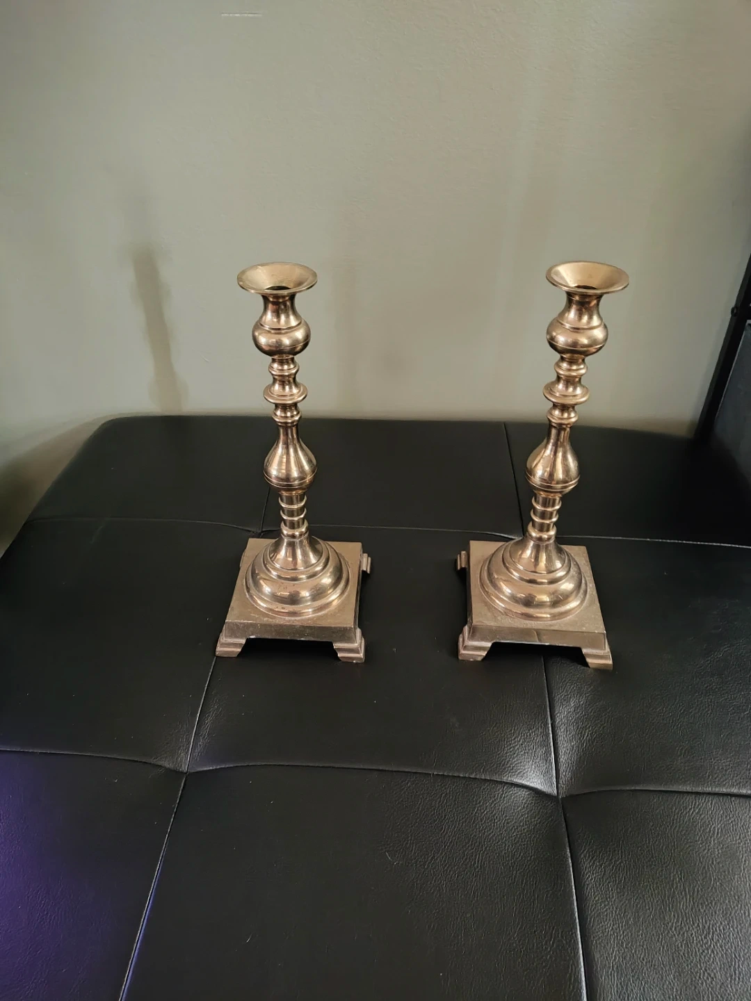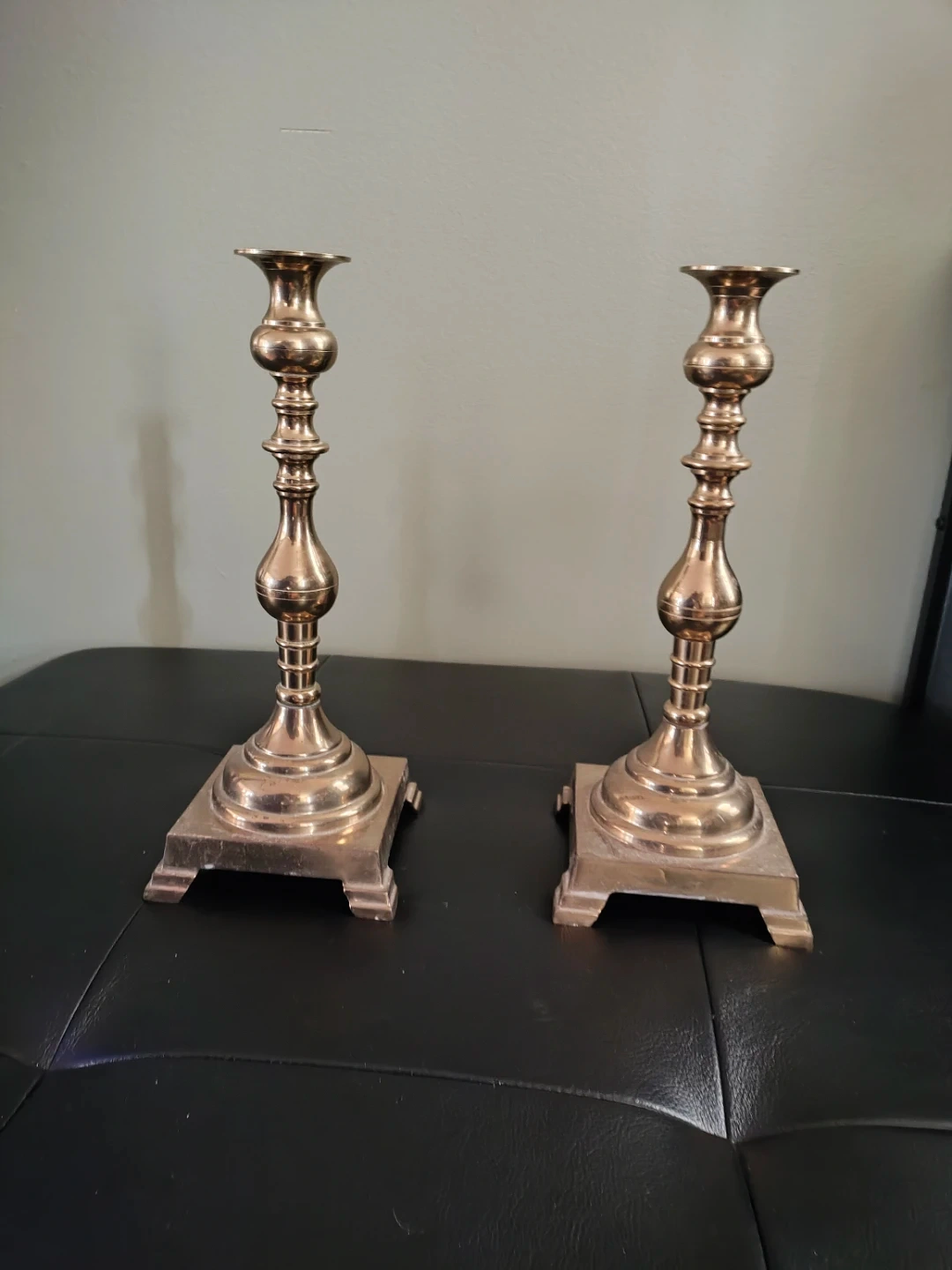 Selling a pair of vintage brass candlestick holders. They have a classic design and would look great on a mantel or table. They are in good condition with some signs of age, which adds to their charm