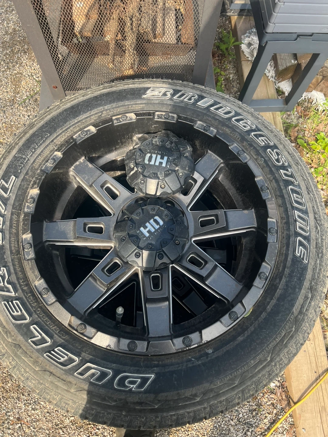 Set of four HD Wheels with Bridgestone Dueler H/L tires. Rims are black and chrome. Tires have good tread.