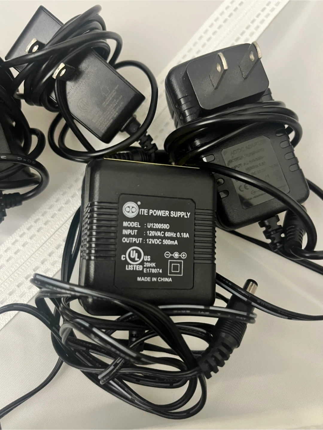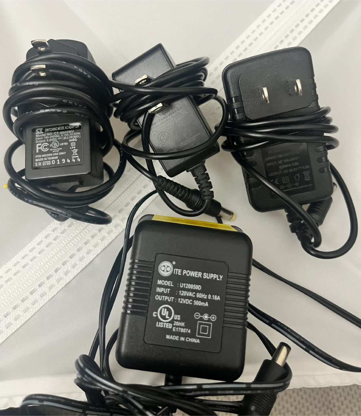 Bundle of four AC/DC power adapters with various models and output specs. Input: 100-240VAC. Outputs include 5VDC 1A, 25.2V 1A, 12V 500mA, and 12V 600mA. These are essential for powering a range of electronic devices.