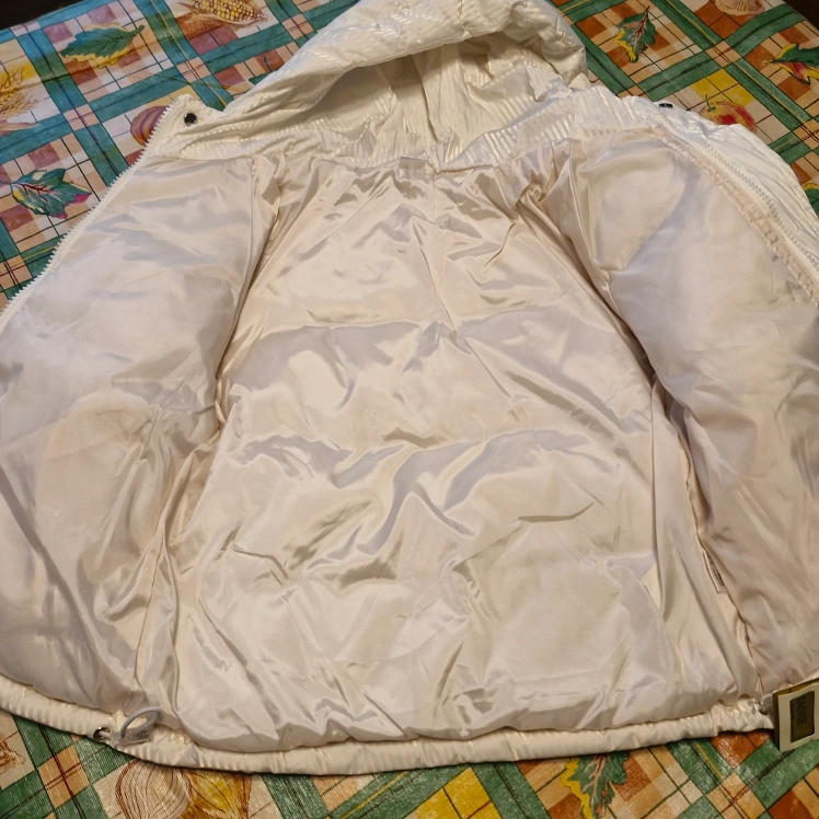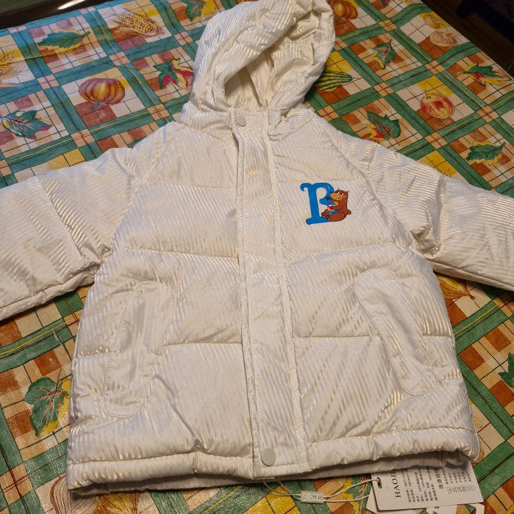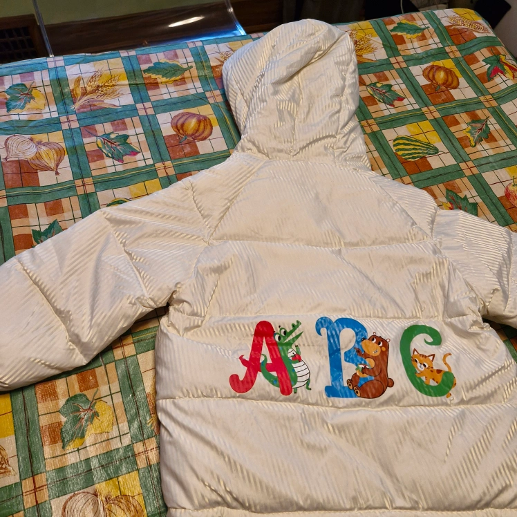 Adorable children's puffer jacket. Off-white colour. Features a hooded design and a unique alphabet print featuring animals. Zipper closure. Warm and cozy for colder weather.