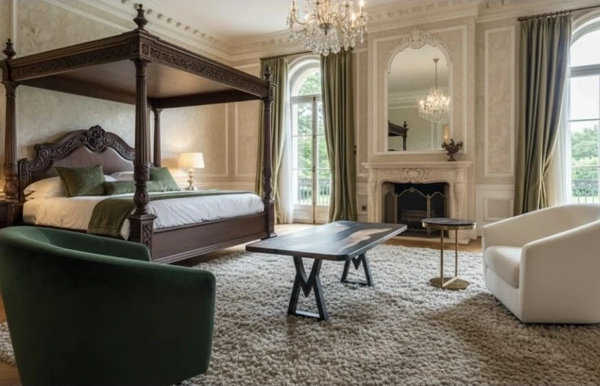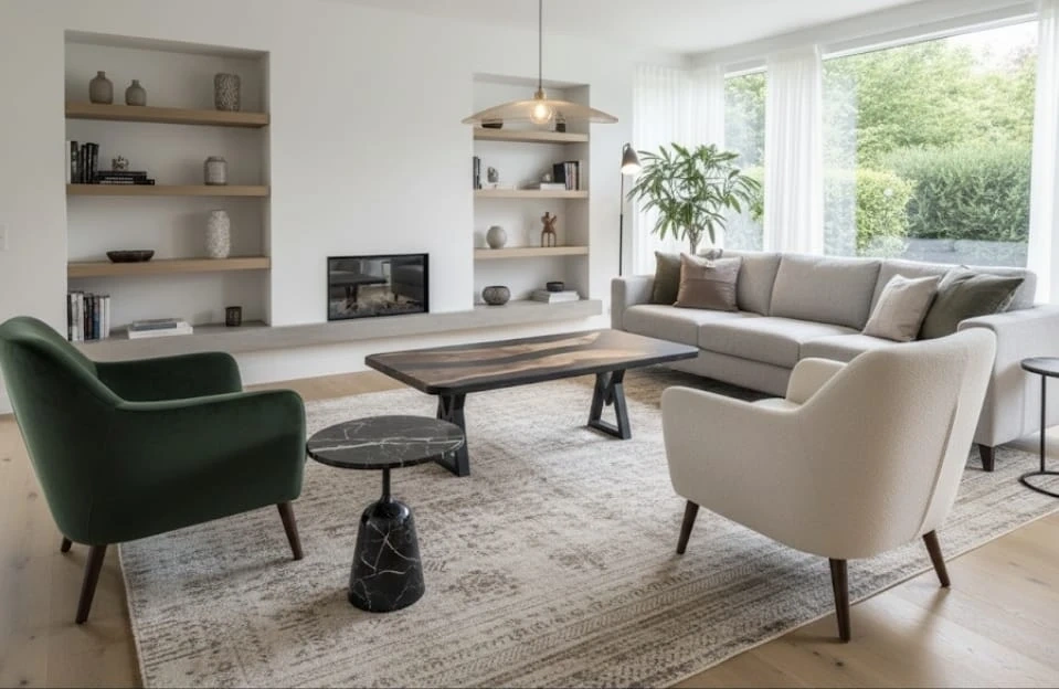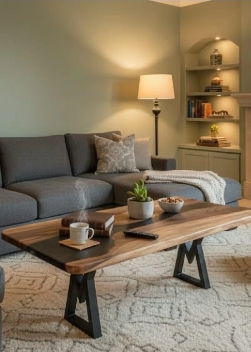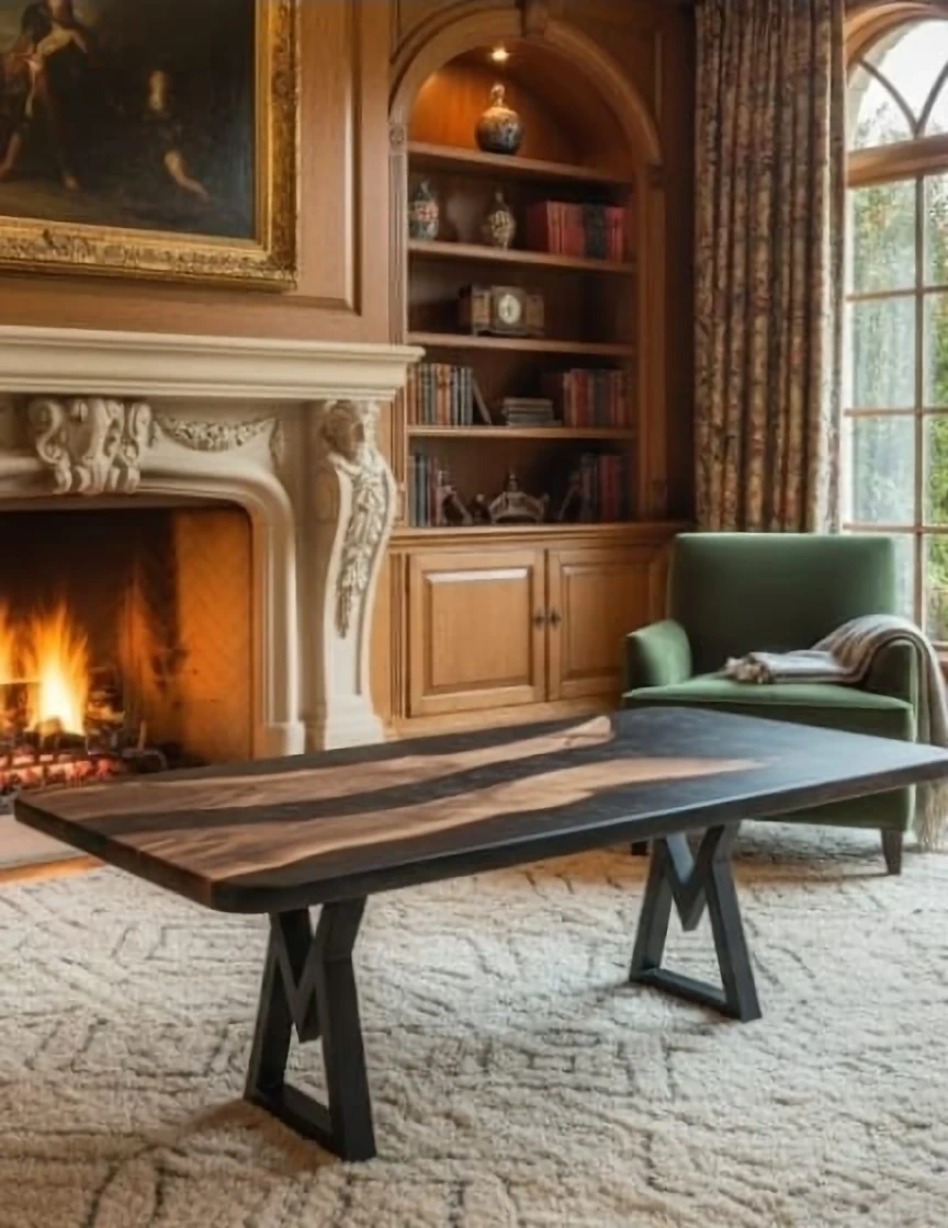 Unique live edge coffee table featuring a natural wood slab top with a striking black epoxy inlay. Its modern metal base provides sturdy support. This table's design adds a rustic yet contemporary feel to any living space.