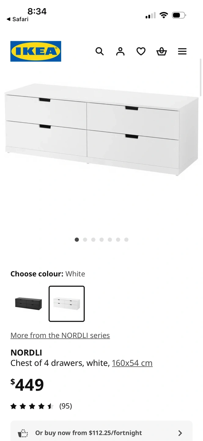Buy & SellIKEA NORDLI Chest of 4 DrawersIKEA NORDLI Chest of 4 Drawers$99White chest of 4 drawers from the IKEA NORDLI series. It's 160x54 cm. Great for storing clothes or linens!ConditionLike newWHERE TO MEETCheck LocationView MapSELLERChristinaEarlscourt200 reviews1 chats·4 favorites·37 viewsSEND CHAT TO SELLERHi Christina! I’m interested in your listing.Hi Christina! I’m interested in your listing.Get the Karrot app to chatSign In to chat