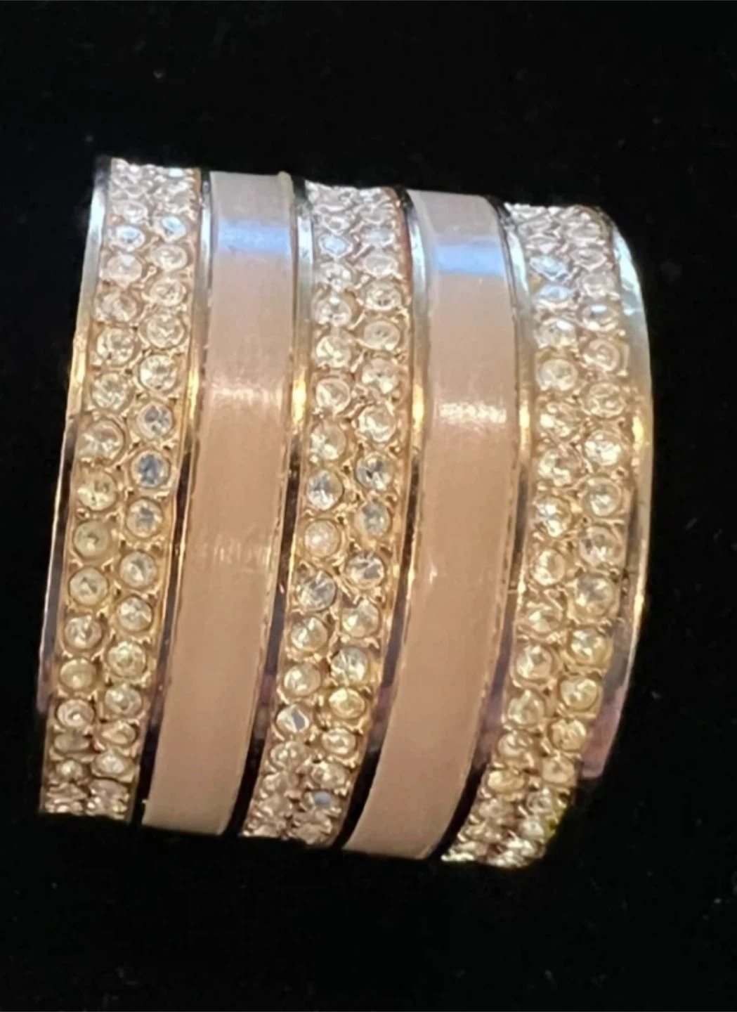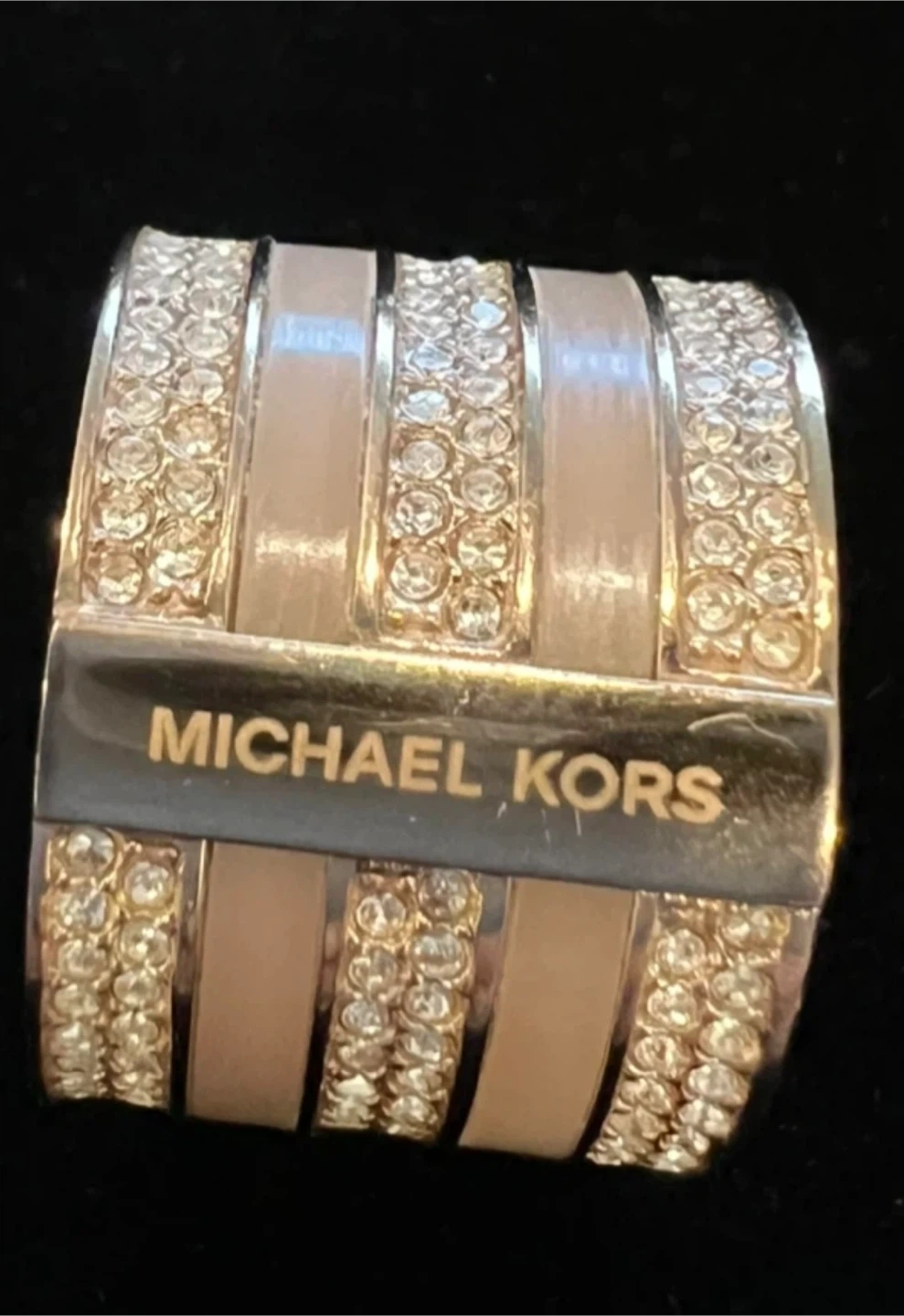 This Michael Kors ring features a wide design with sparkling crystal accents alternating with smooth bands. It's a statement piece that adds a touch of glamour. The bracelet has a rose gold-tone finish.