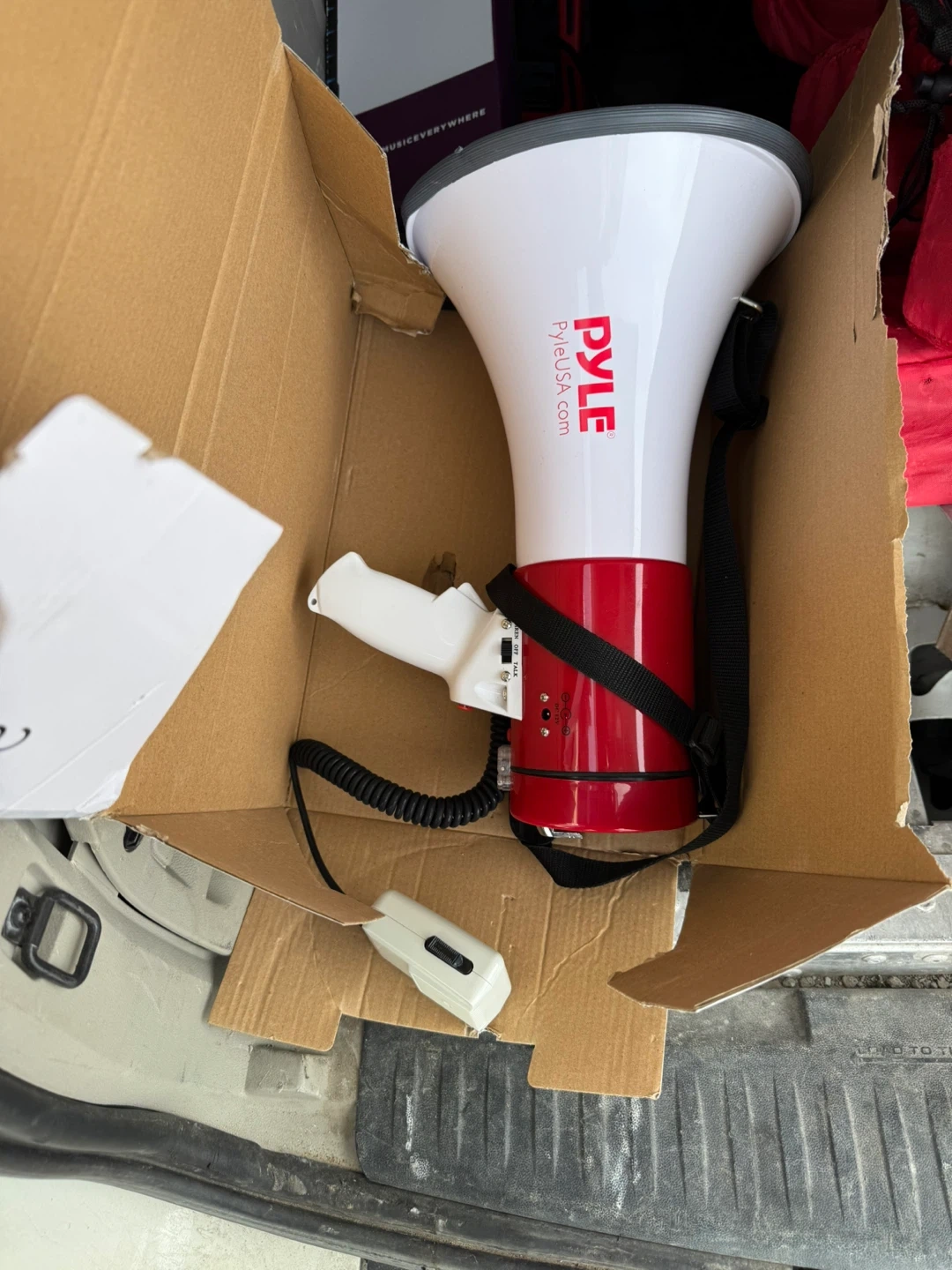 This Pyle PMP58U megaphone bullhorn has a 50W max power output and comes with a detachable handheld microphone. It features talk and siren modes and supports USB storage up to 32GB. It's powered by D-cell batteries, not included. This megaphone is useful for announcements and crowd control.