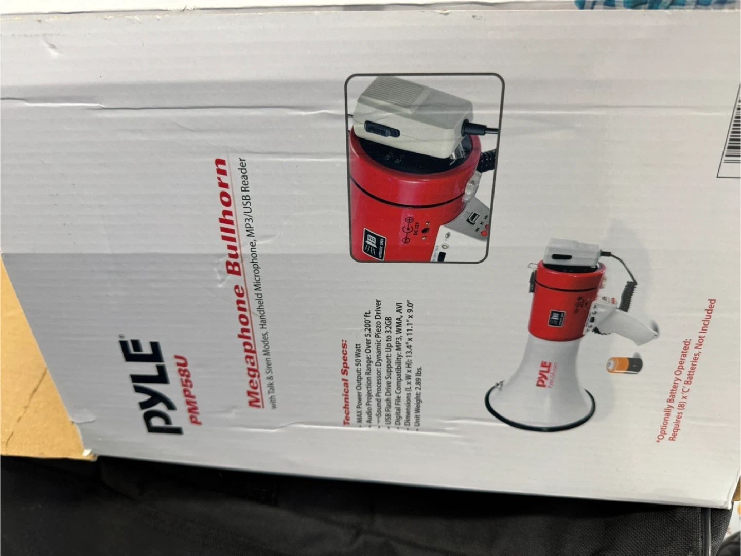 This Pyle PMP58U megaphone bullhorn has a 50W max power output and comes with a detachable handheld microphone. It features talk and siren modes and supports USB storage up to 32GB. It's powered by D-cell batteries, not included. This megaphone is useful for announcements and crowd control.