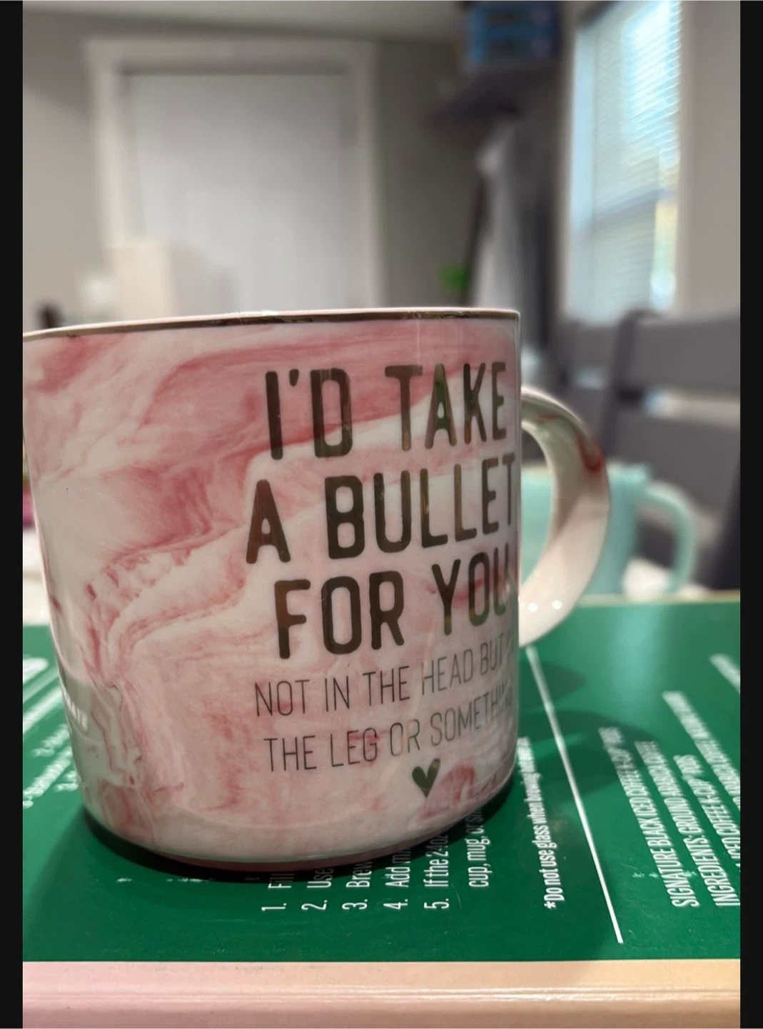 Here's a fun novelty mug! It has a pink and white marble design with gold trim. The text says, "I'd take a bullet for you, not in the head but the leg or something." It's sure to bring a smile to your face every time you use it