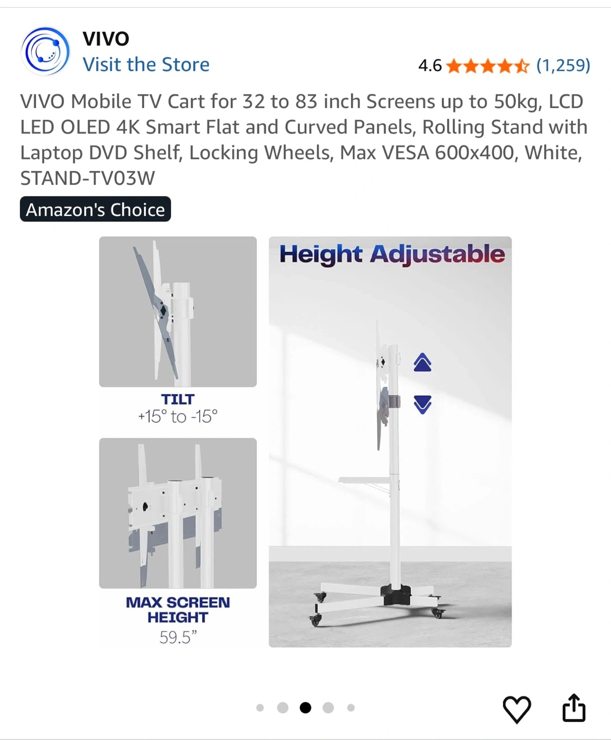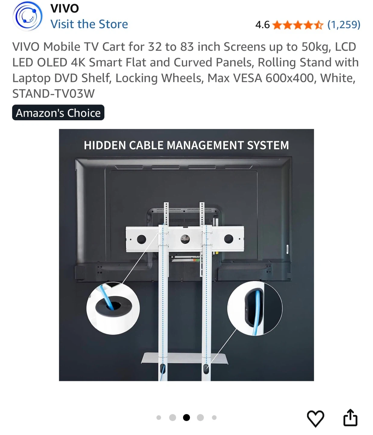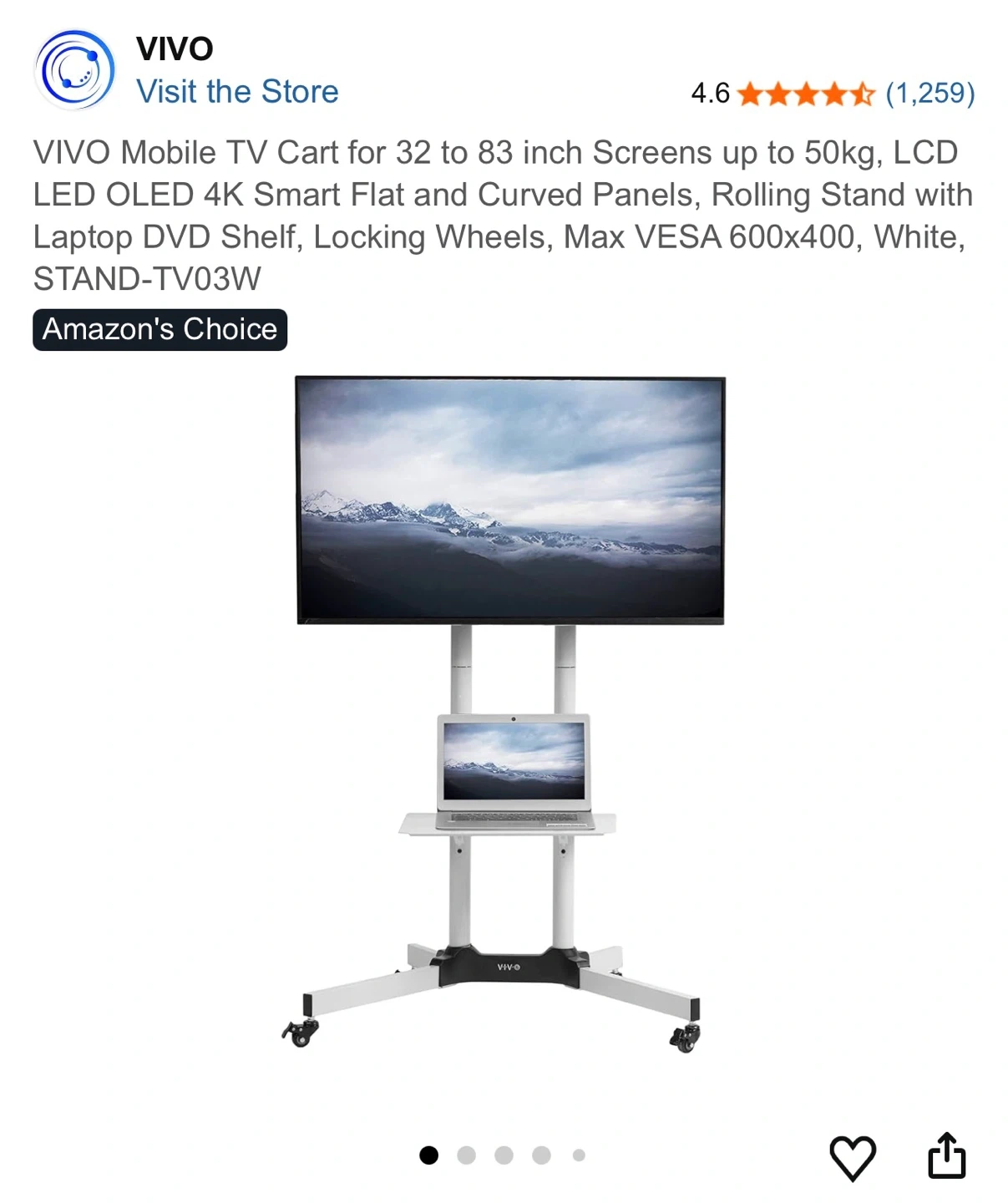 This is a white VIVO mobile TV cart stand for screens 32" to 83". It includes a laptop/DVD shelf and locking wheels. VESA mounting is up to 600x400mm.