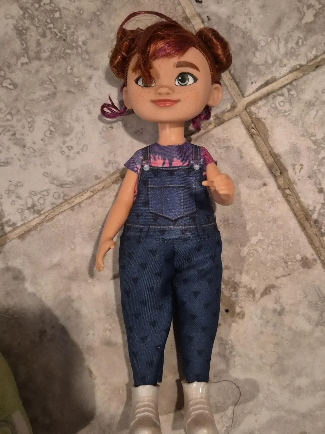 This is a fashion doll with red hair styled in two buns and purple highlights. She's wearing a tie-dye shirt and blue denim overalls with a triangle pattern. Her white boots complete the look.