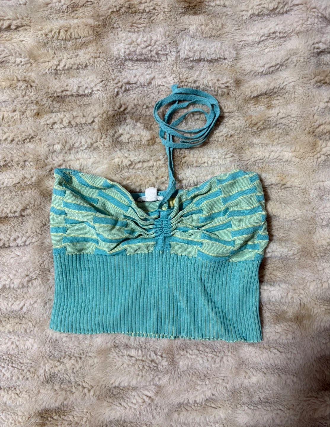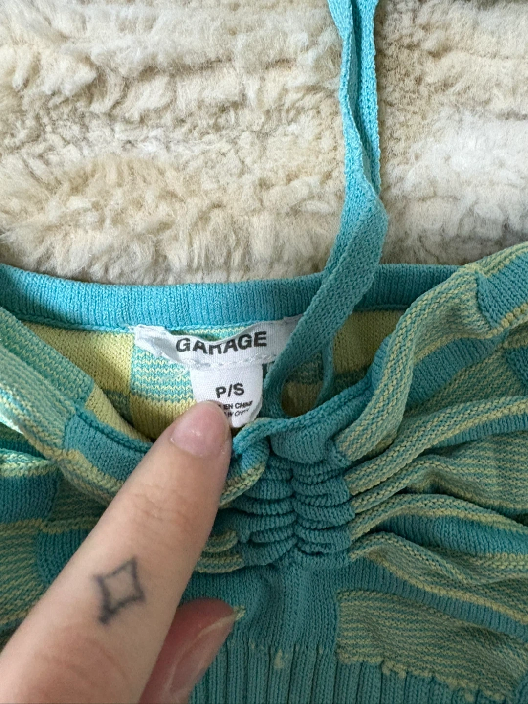 GARAGE brand tube top in size S. It's a blue and yellow striped knit material with a tie-front detail. You can use it as a halter strap or tie it in the front! 🩵💛 only worn once