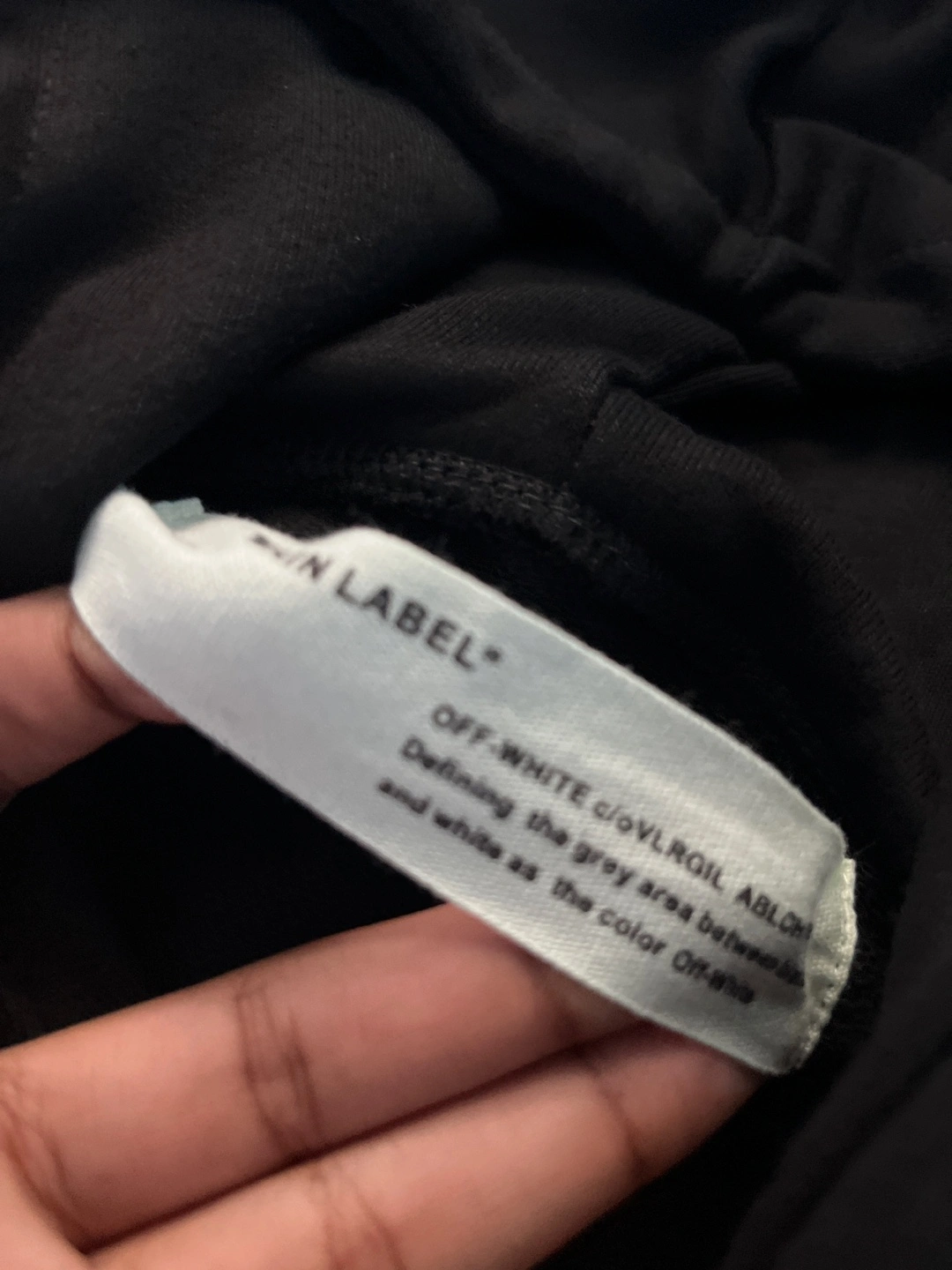 I am selling this black Off white hoodie. Featuring white diagonal stripes on the sleeve. An oversized logo on the back. Perfect for relaxing on a lazy afternoon.