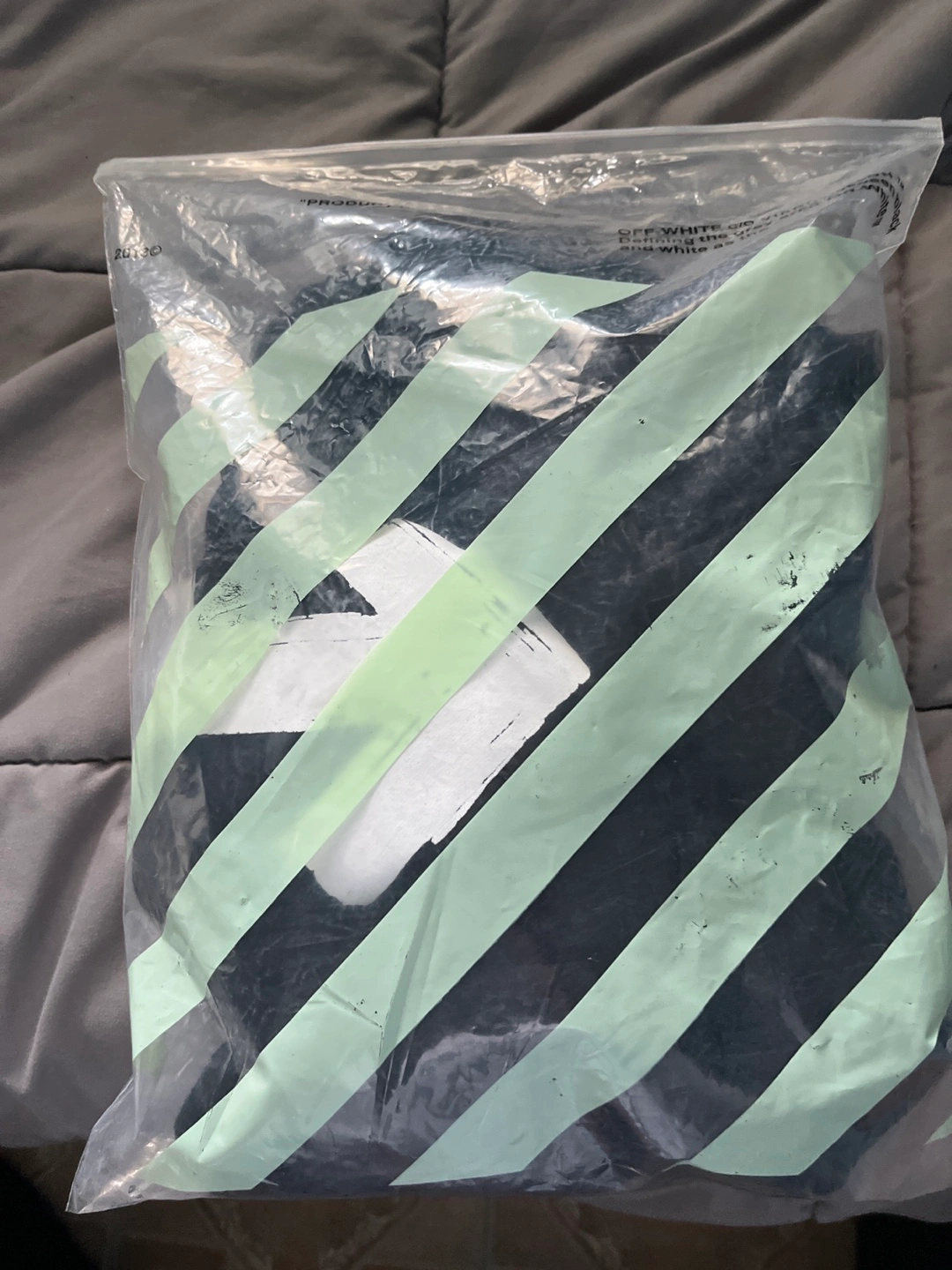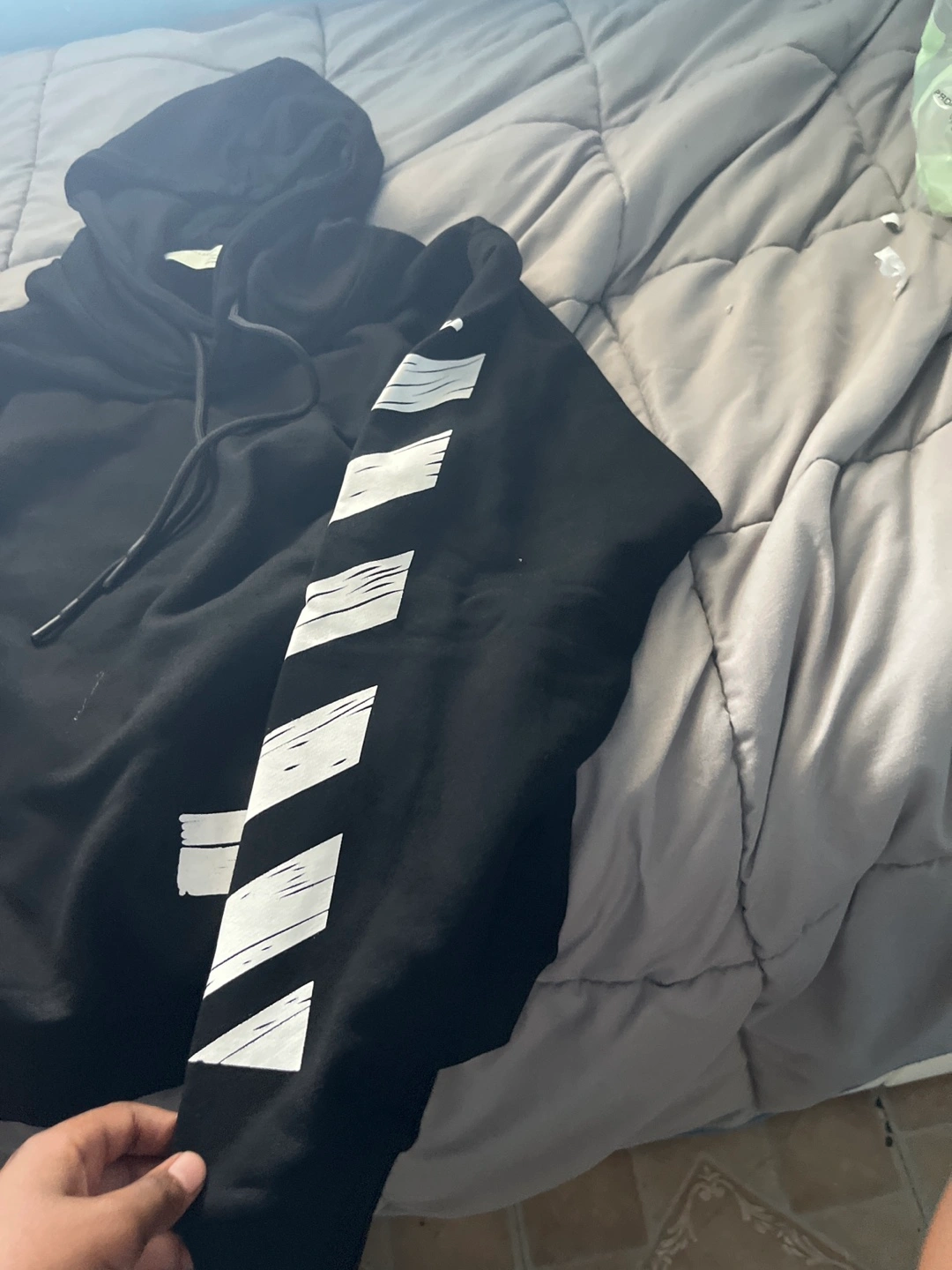 I am selling this black Off white hoodie. Featuring white diagonal stripes on the sleeve. An oversized logo on the back. Perfect for relaxing on a lazy afternoon.