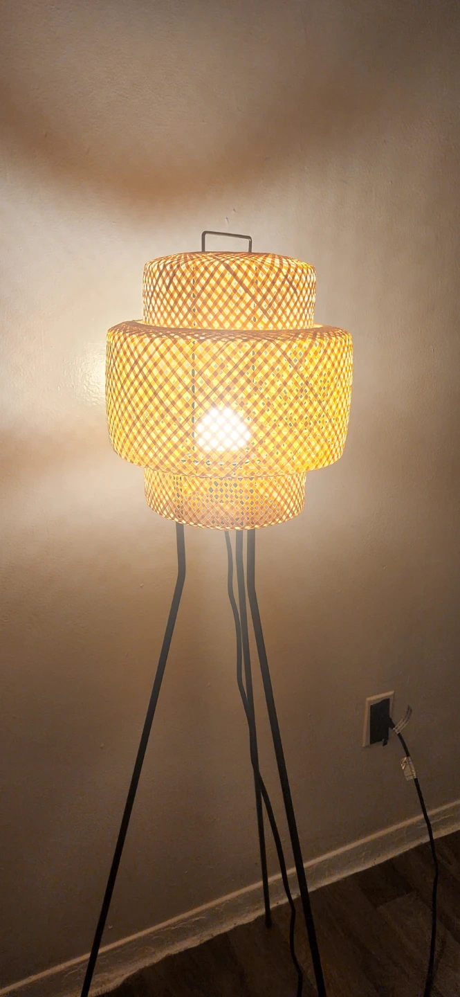 Barely used.This accent floor lamp features a natural woven shade on a black tripod base. It's designed to add a touch of global style to your living space. Great for ambient lighting in any room!(retail 100$+)cash only