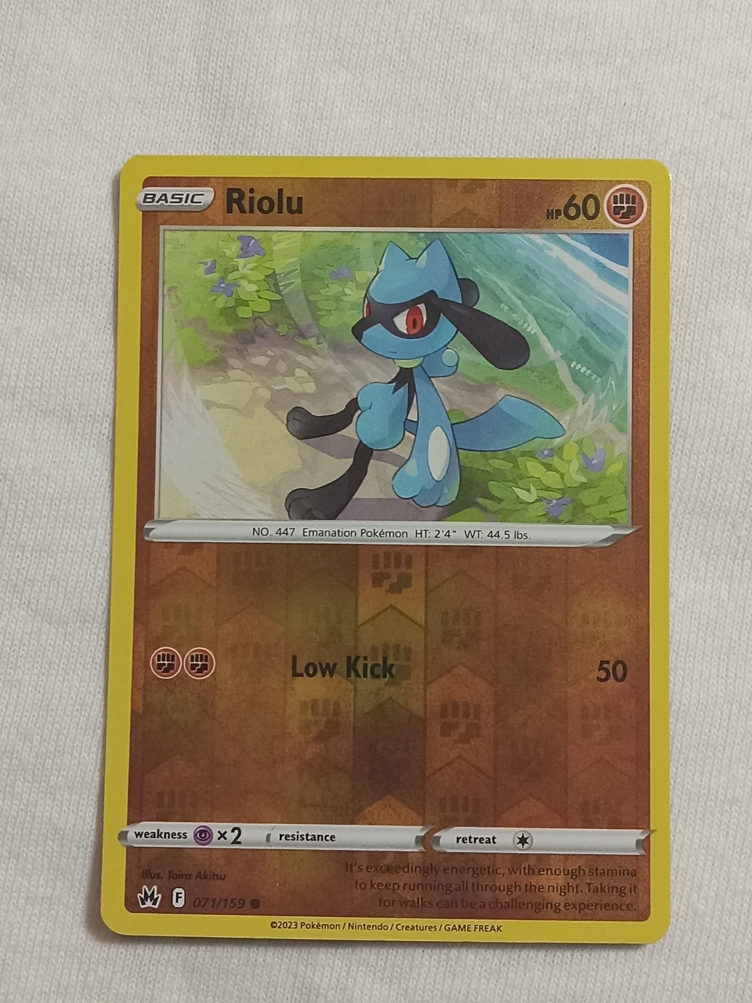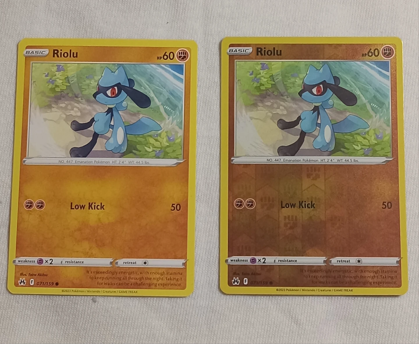 2 pokemon cards from the Crown zenith set featuring Riolu. Cards are in Near Mint Condition, and come in the standard and Reverse holo versions.