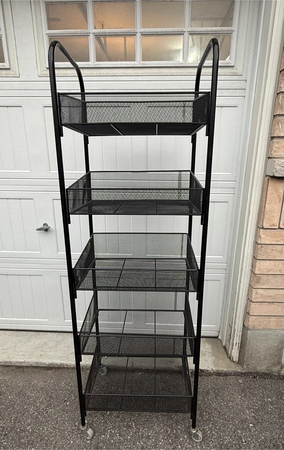 Sturdy black metal mesh rolling cart has five tiers of storage baskets. Frame is constructed from durable metal with a matte black finish. Bottom is equipped with four swivel casters for easy movement. Mesh design allows for airflow and visibility of contents.