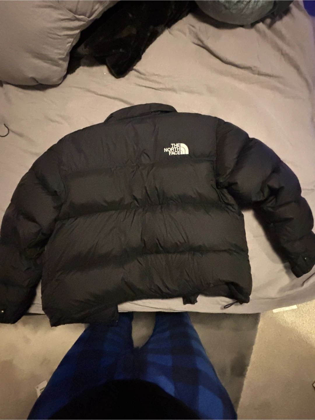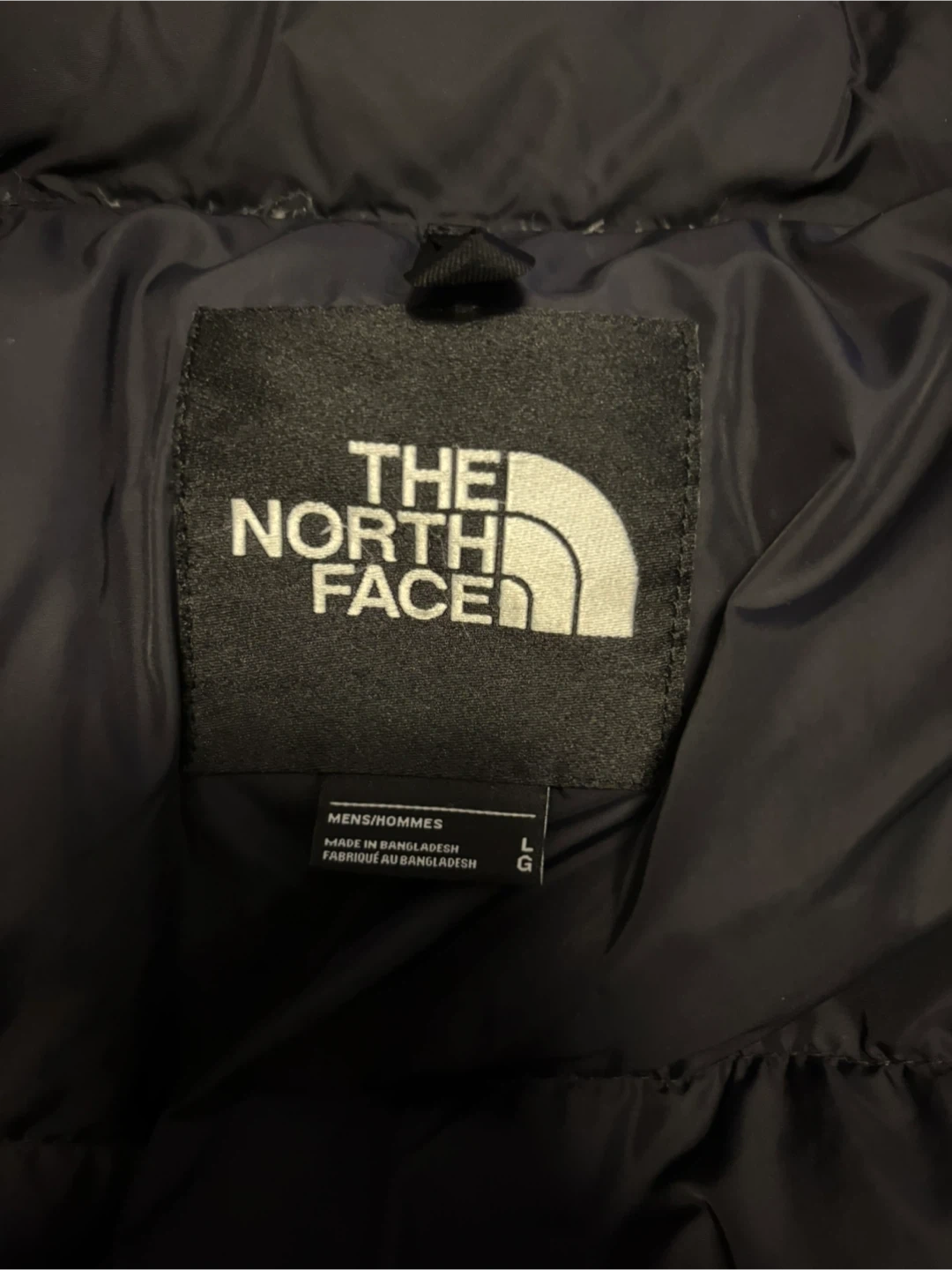 This is a black puffer jacket from The North Face. It's a men's size large and made in Bangladesh. It's a warm, insulated jacket perfect for cold weather!