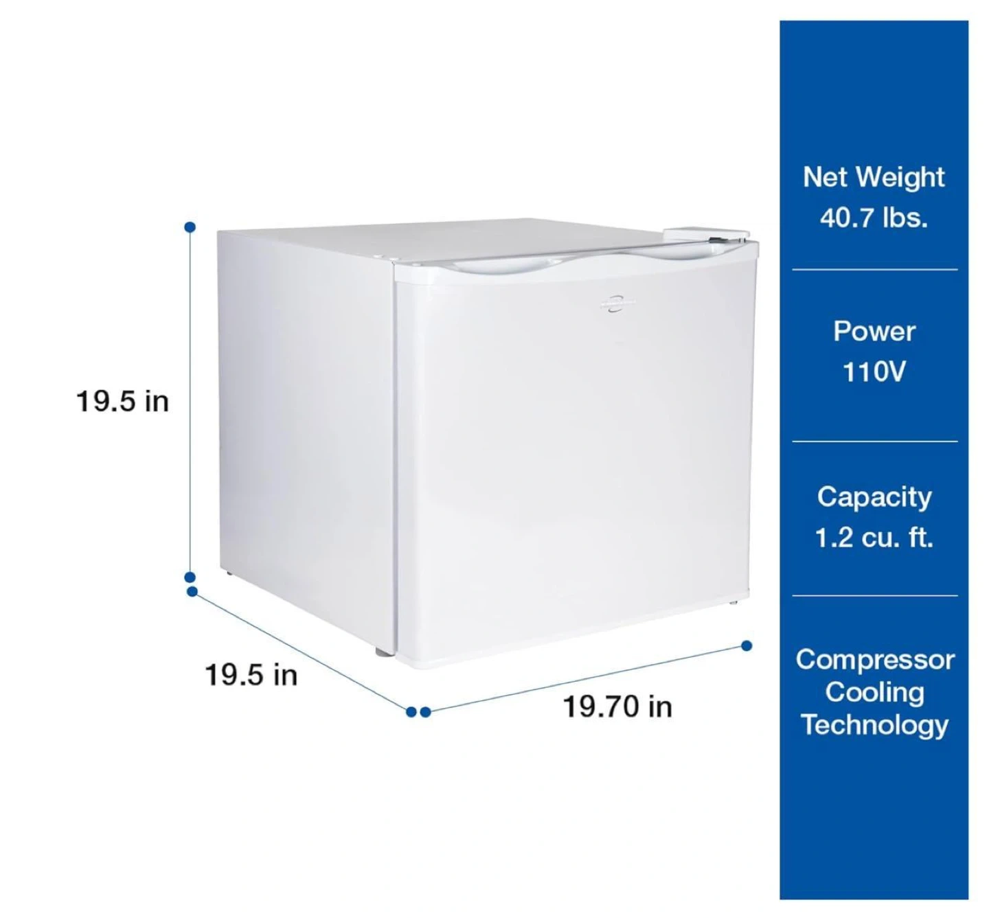 This white compact mini fridge offers 1.2 cu. ft. of capacity and uses compressor cooling technology. It runs on 110V power and has a net weight of 40.7 lbs. The dimensions are 19.5 inches in height, 19.5 inches in width, and 19.70 inches in depth. This fridge is handy for small spaces or extra cooling needs!