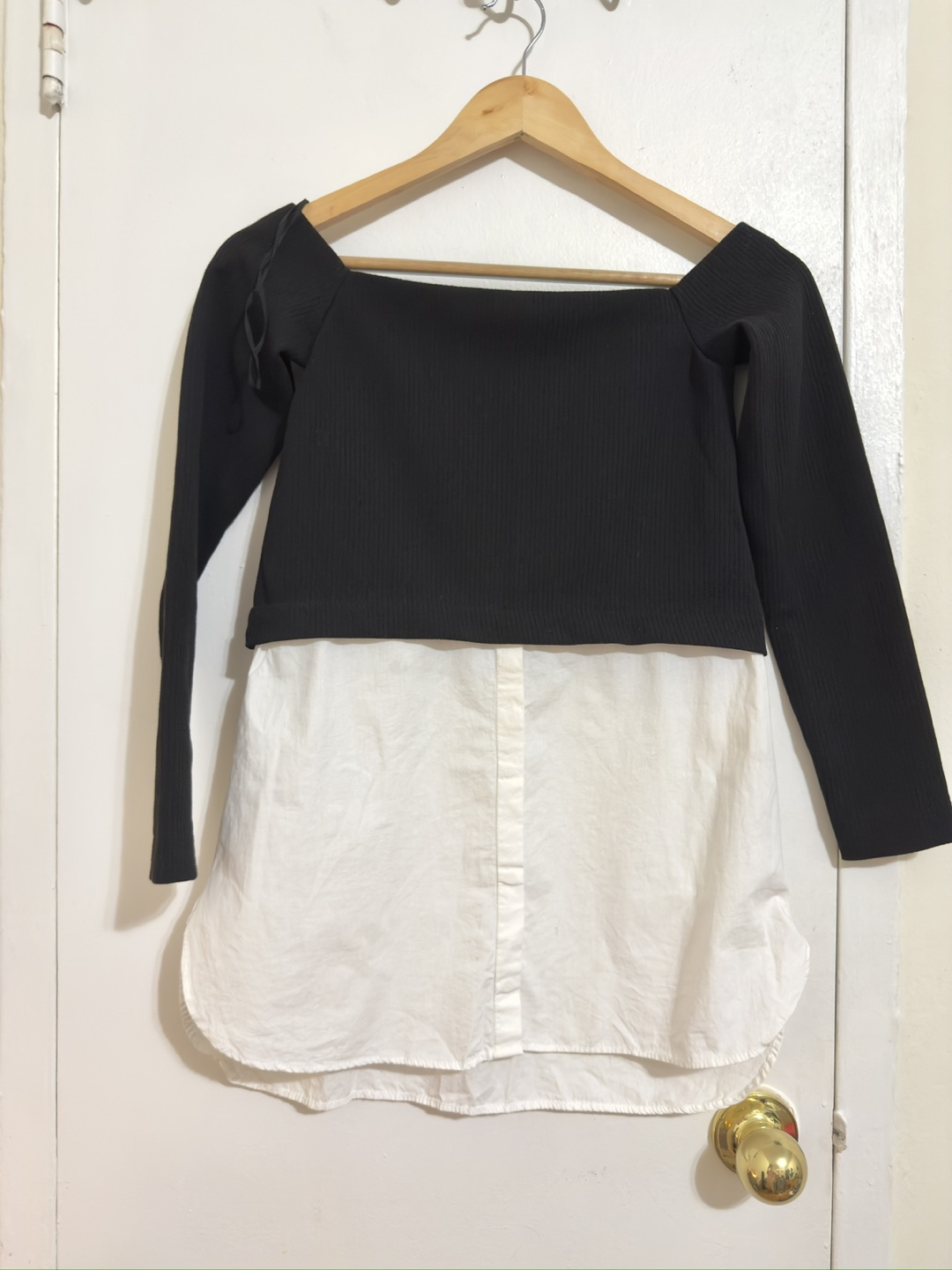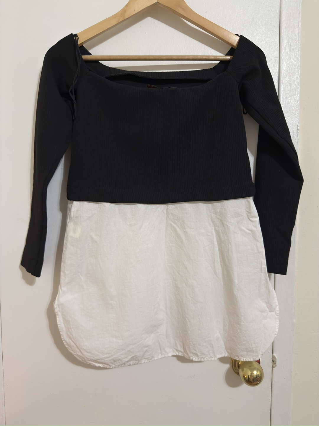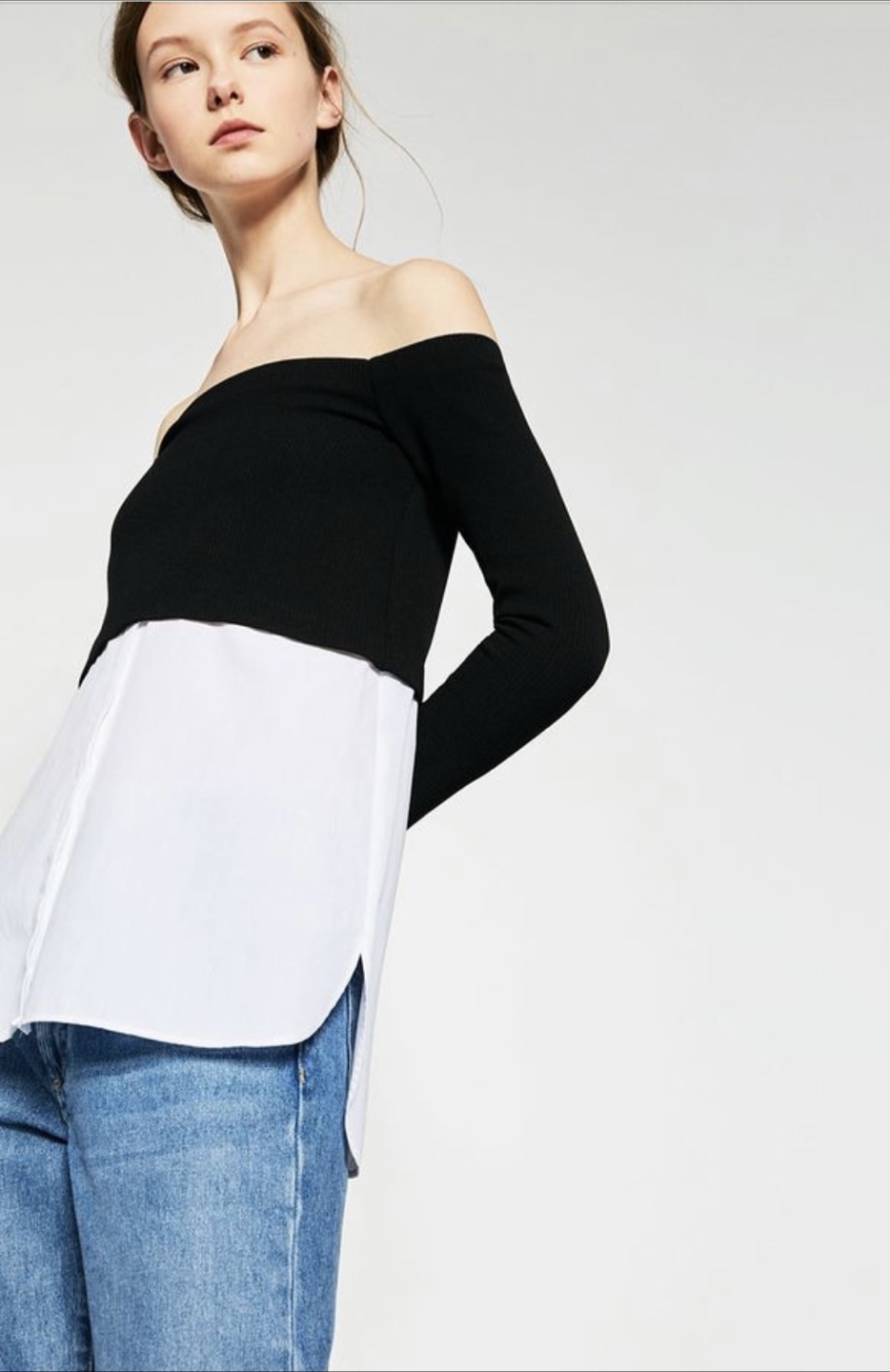 This is a Zara top featuring a unique layered design! The upper part is a black, ribbed knit, while the lower part is a white woven fabric. It's a stylish and versatile piece that can be dressed up or down. Perfect for adding a touch of sophistication to your wardrobe