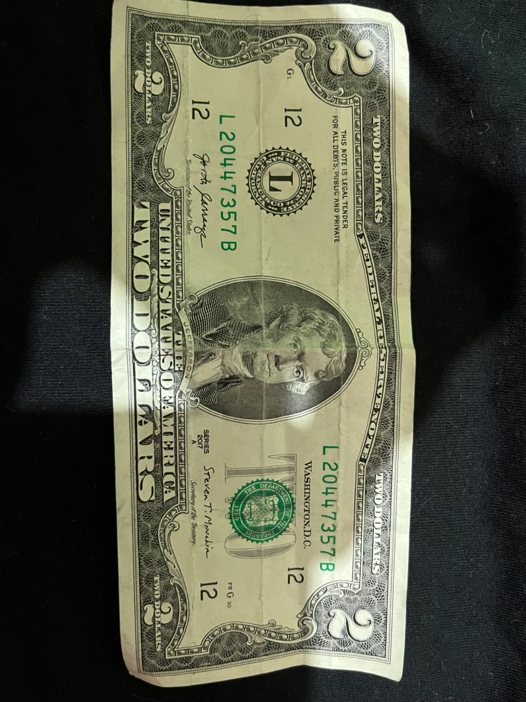 It's just a crisp, ordinary US $2 bill... which many believe to be a natural-born good luck charm.
