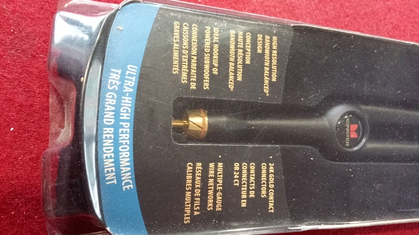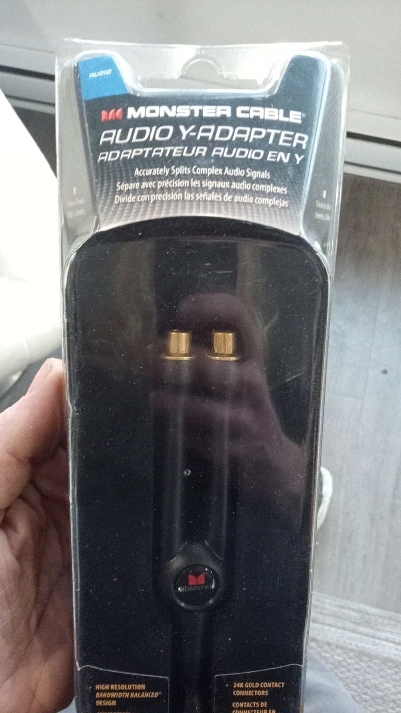 Monster Cable audio Y-adapter for splitting complex audio signals. Features 24K gold contact connectors. High resolution, bandwidth balanced design.