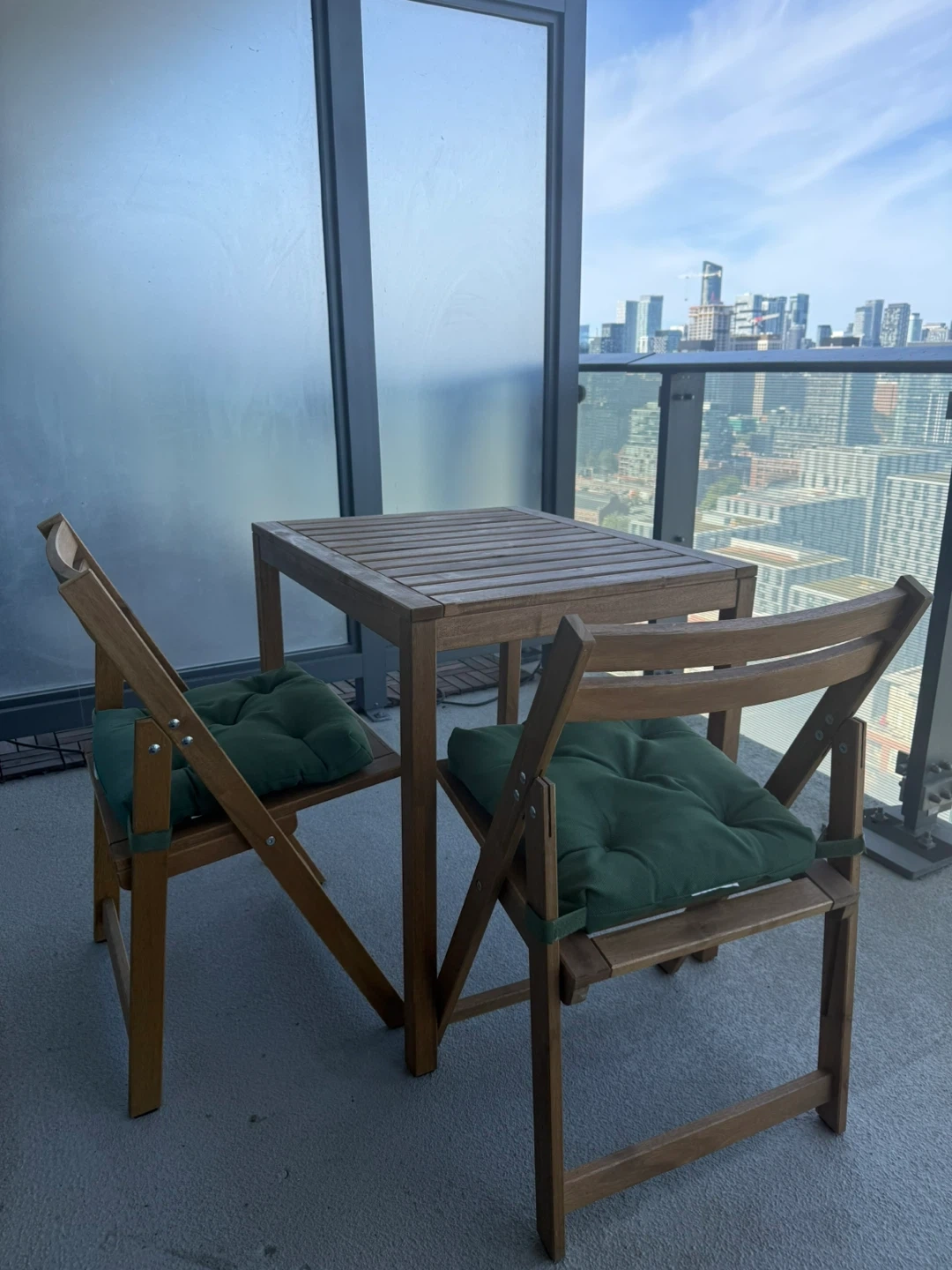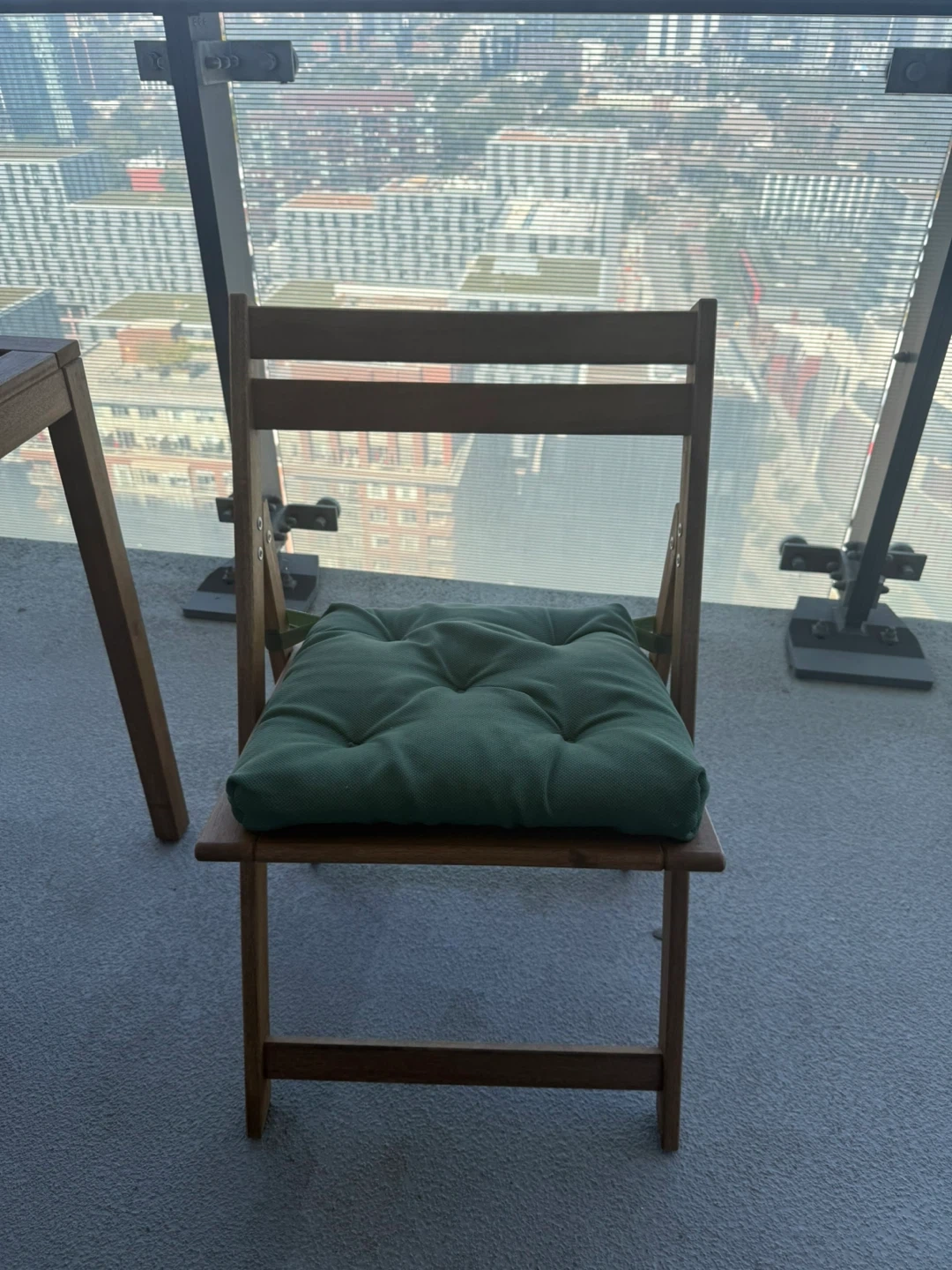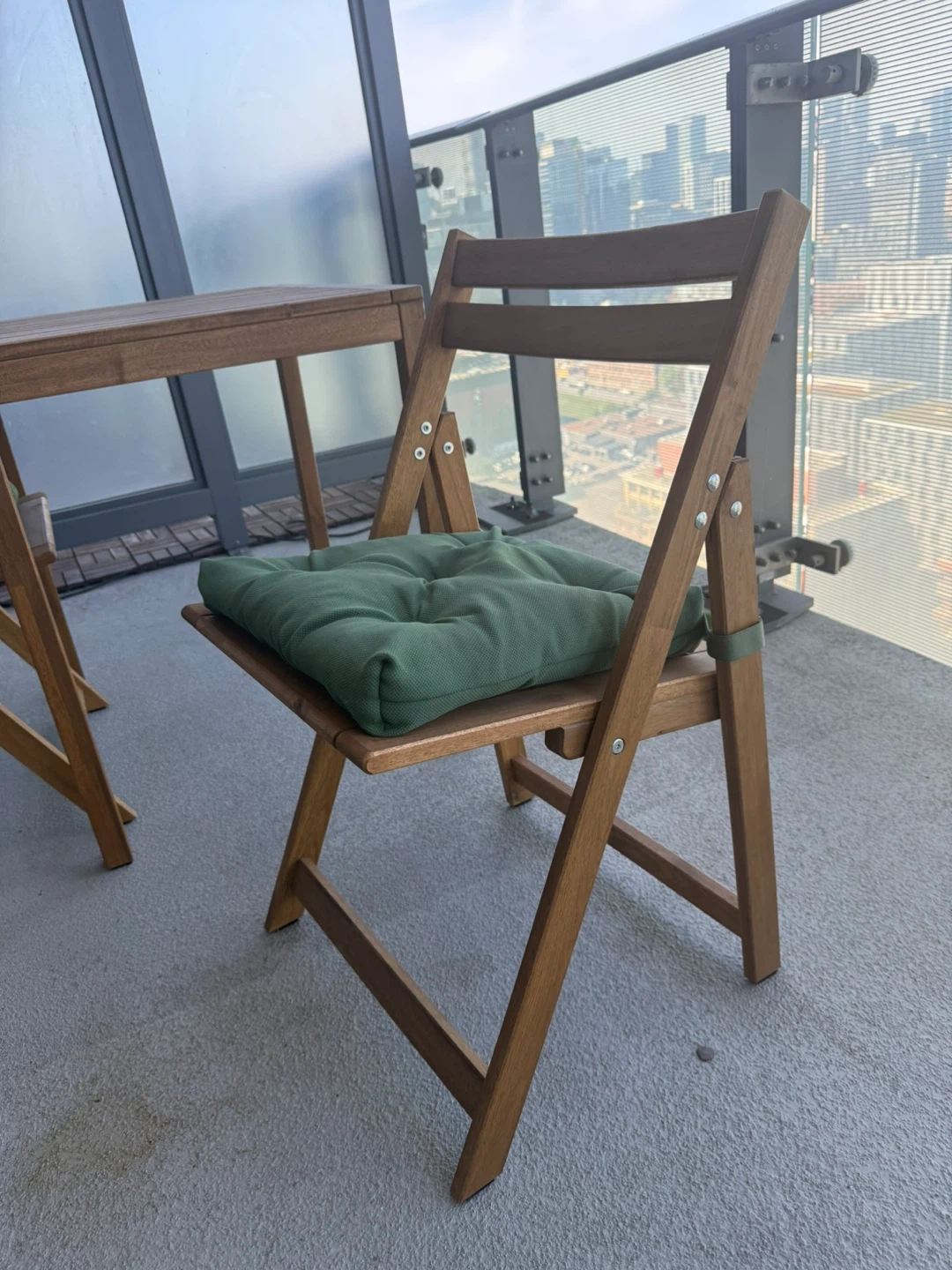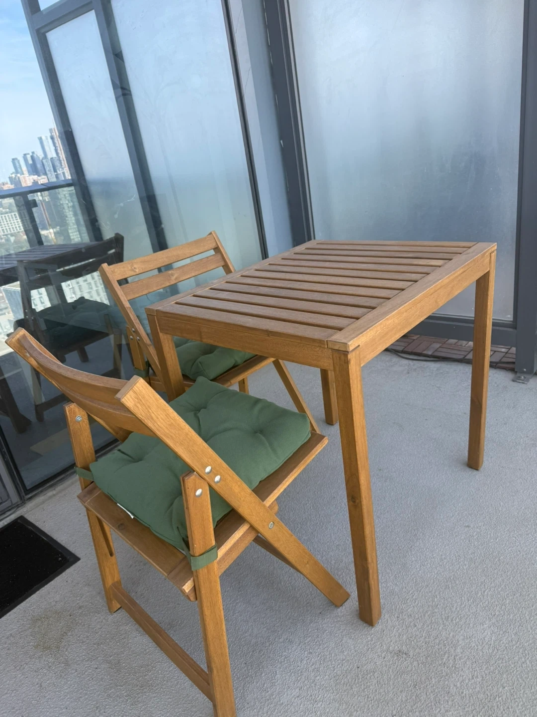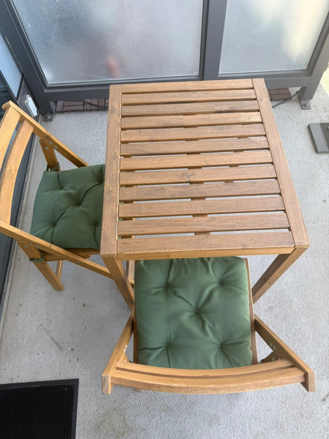 Selling an Ikea Tarno table with two folding chairs, complete with green cushions! Perfect for a small balcony or patio. The wood has a nice, natural finish