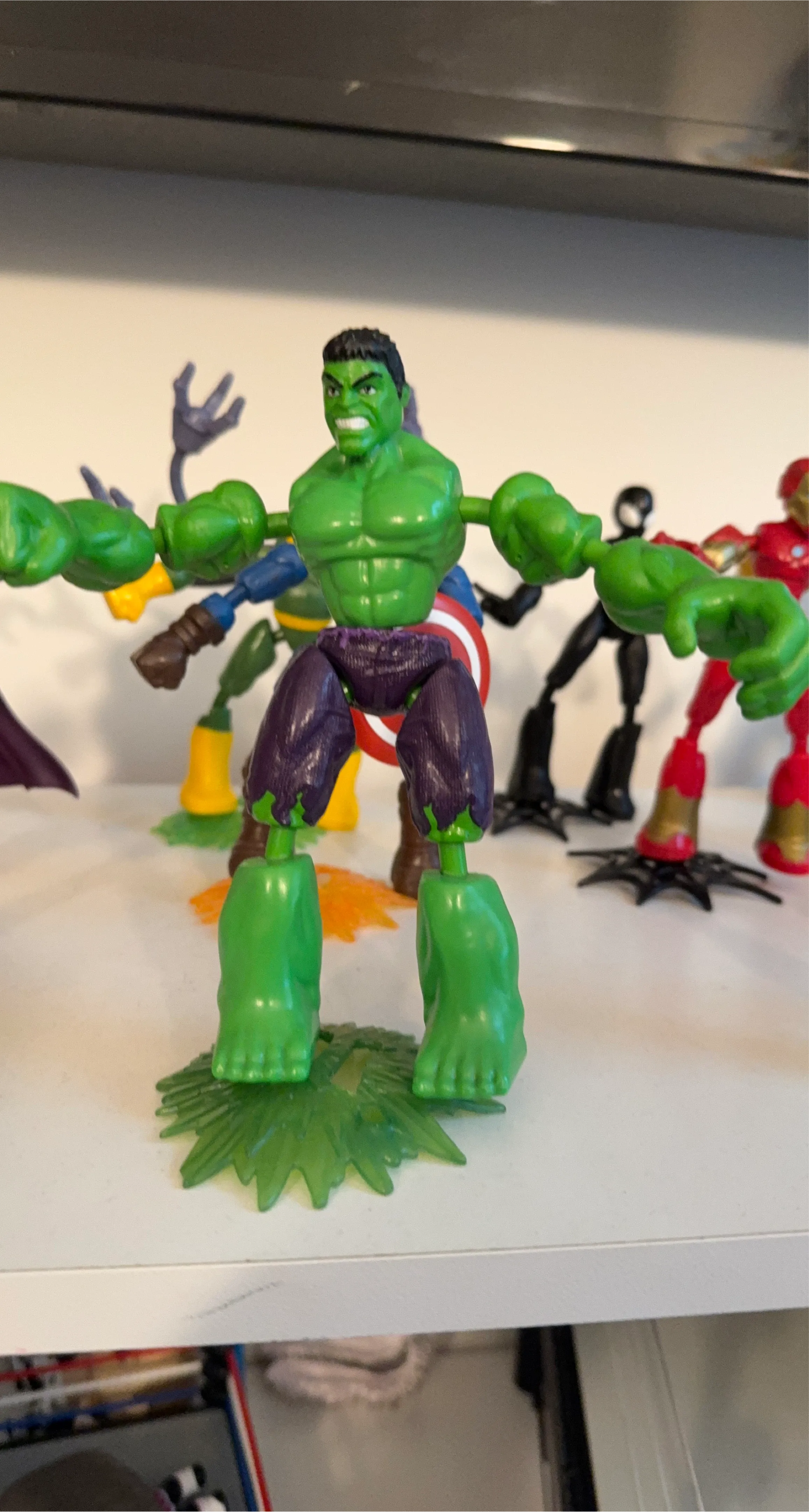 Selling a Marvel Stretch Hulk action figure. It's in good condition and ready for a new home! It's green and purple and would be great for any Marvel fan