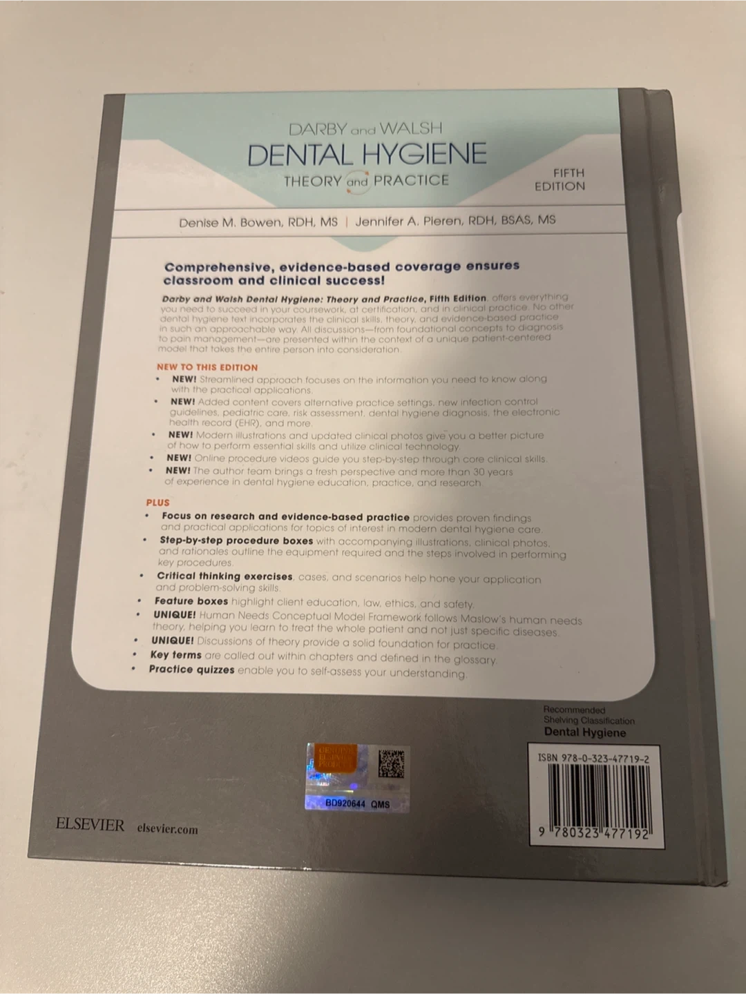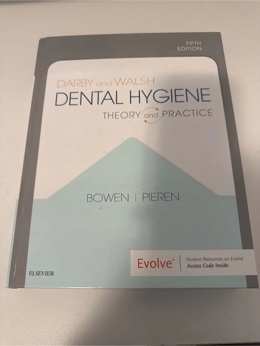Selling a copy of Darby and Walsh's Dental Hygiene Theory and Practice, Fifth Edition. This textbook covers classroom and clinical success with comprehensive, evidence-based coverage. It includes step-by-step procedures and critical thinking exercises to help with your application of knowledge. A great resource for any dental hygiene student!