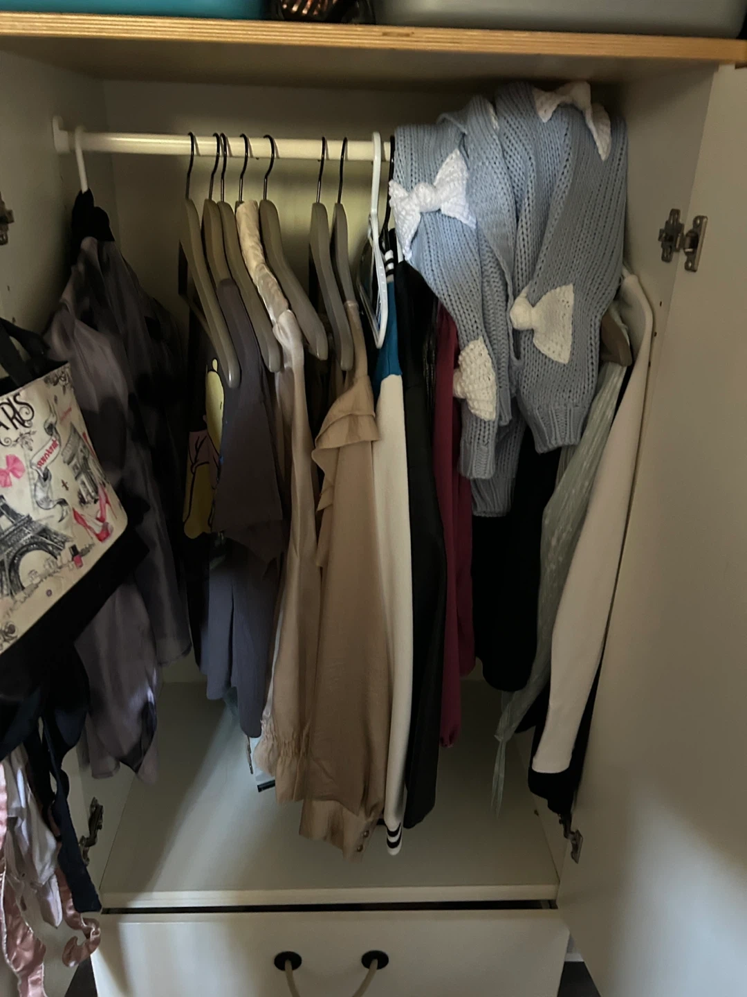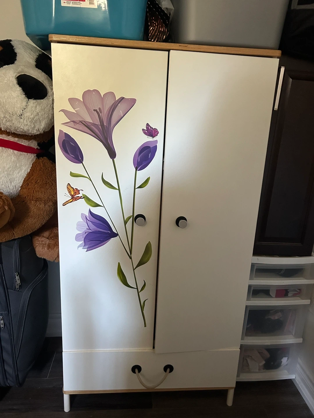 Selling a cute wardrobe in great condition! It features a lovely floral design on one side. Inside, there's a hanging rod and a drawer at the bottom for extra storage. Perfect for a kid's room or anyone needing a bit more closet space!