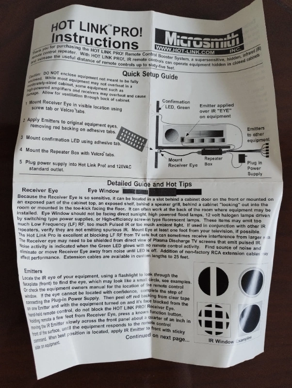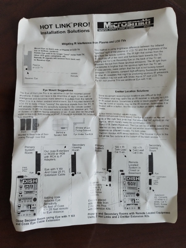 This product is brand new, has never been used. It was stored in a box and the instructions got a little crumpled. Here is a portion of the product description from the manufacturer: Hot Link Pro Remote Control Booster Extends the Range of Remote Controls to 75 feet! If your AV equipment is housed behind an opaque cabinet door or in a closet, IR remote signals will not be able to reach it. Hot Link Pro solves this problem by routing the IR signals into the closed cabinet or closet, effectively connecting the AV equipment’s IR receiver and transmitter of your remote control. This allows you to keep equipment out of sight and out of reach of inquisitive little fingers, dust, and dirt. The high sensitivity of the Hot Link Pro IR receiver circuit also acts as a remote control booster, extending the range of your remotes. Controls hidden AV equipment using IR remotes behind opaque doors Remote control booster doubles remote-to-eye distance for up to 6 AV components One Eye fits all applications. Works with virtually all Plasma and LCD TVs, satellite and cable receivers and other AV gear and can be mounted anywhere. Does NOT need line of sight and can be mounted on BACK of TV Blue “Talk-Back” LED confirms receipt of commands between the IR receiver and transmitter Hot Link’s IR Eye can be mounted virtually anywhere (on the back of flat panel displays, behind door slots, speaker grills, cabinets and wall plates without modification or under toe kicks and sub-woofer speakers). It is more than 4 times as sensitive as standard IR receiver circuits. Hot Link Eye is broadband, eliminating the need for special receivers at different frequencies and is the absolute best at mitigating IR interference from plasma and LED TVs. What Hot Link Pro does Hot Link Pro is a patented product that both allows equipment to be hidden and doubles the distance of remote controls by enhancing IR receiver circuit sensitivity. It is generally sold as a “single-box solution” for installers and end users. It is “radio-less” and has no attachments to remotes, no batteries, no antennas and no exposed cables to trip over. Hot Link hides inside the cabinet and “sees” even the weakest signals from remotes. It is very compatible with LCD and Plasma TVs when the Eye is mounted out of sight, just behind the display. With accessories, Hot Link Pro’s sensors and emitters can be easily extended. Repeats carrier frequencies 18Khz to 120Khz. Hot Link Pro IR remote control extender system is compatible with a wide range of AV and home theater equipment, Even IR Computer Mouse and Keyboards which used to require IR receiver USB devices. Now they can be used twice as far away. Here is a link to the manufacturer website: https://www.hot-link.com/product/hot-link-pro/ If you have any questions please let me know and I will do my best to answer. Cash only, pickup only. Thanks