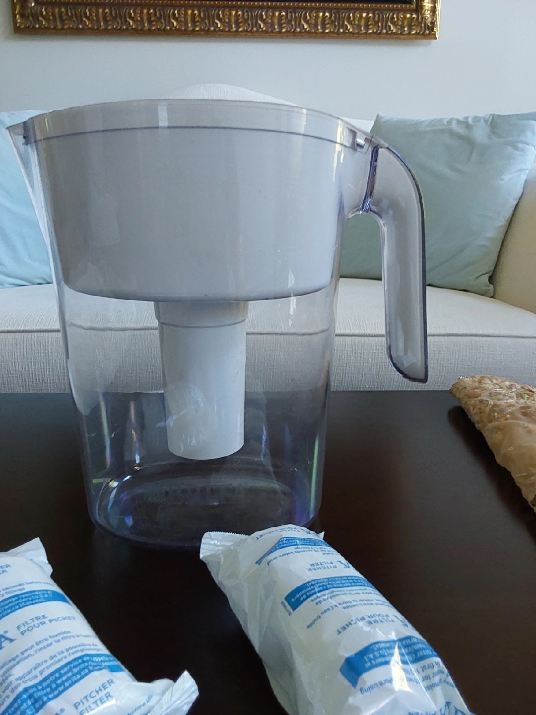 Selling a Brita water filter pitcher. It comes with two pitcher filters. The filter packaging says 'Filtre pour Pichet' and 'Pitcher Filter'. Great for clean, fresh water!
